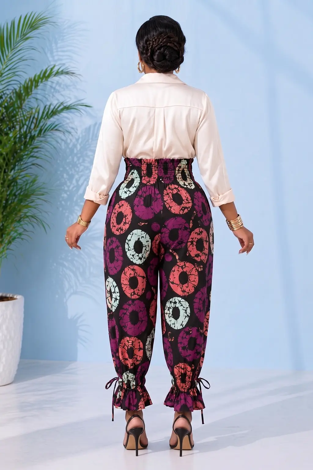 Designed with a focus on both style and ease, these African print trousers feature a broad, smocked elastic waistband that sits high on the natural waist for a secure and comfortable fit. A modern side slit adds a touch of airiness and movement, while the functional lace-up ties at the ankles allow you to customize the taper and volume to suit your footwear. Whether you pair them with a simple bodysuit for a weekend brunch or a tailored blazer for a creative workspace, these pants offer a polished, intentional look.