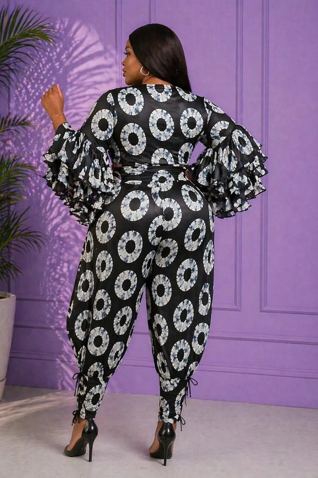 The top is designed as a functional wrap, featuring a deep V-neckline and tiered ruffle sleeves that provide a beautiful sense of movement and volume. This wrap closure allows you to adjust the fit perfectly to your waist, ensuring a secure and personalized feel. Complementing the top are the high-waisted balloon-style trousers, which feature a wide smocked waistband for maximum comfort and a unique lace-up detail at the ankles. These adjustable ankle ties allow you to control the volume of the leg, making it easy to style with both strappy heels and pointed pumps.