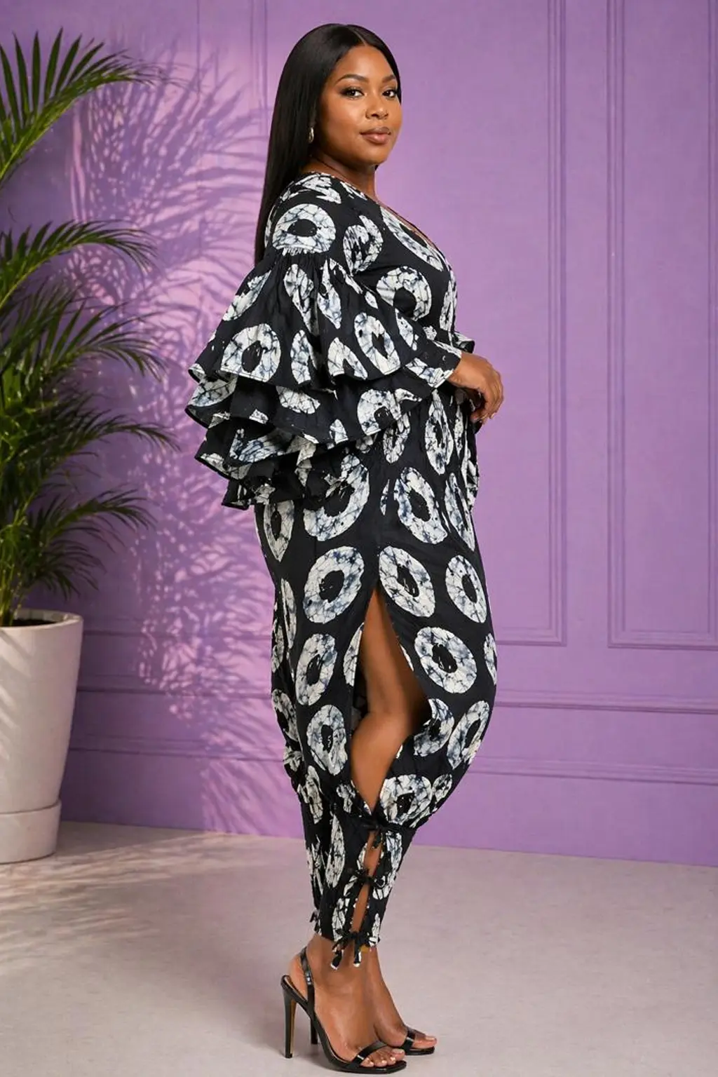The Adire Mono African Print Pants Set is a striking balance of traditional artistry and bold, modern tailoring. This two-piece ensemble features a captivating monochrome “record” motif, inspired by classic Adire tie-dye aesthetics. Crafted from 100% premium African wax cotton, the fabric offers a crisp, high-quality structure that keeps the architectural details of the set looking sharp from day to night.