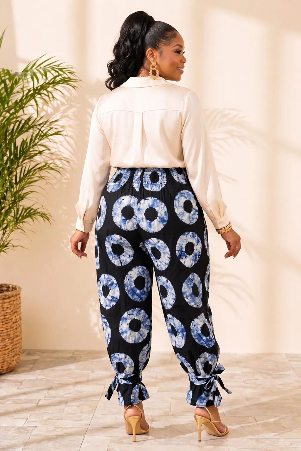 Designed with a focus on both style and ease, these African print trousers feature a broad, smocked elastic waistband that sits high on the natural waist for a secure and comfortable fit. A modern side slit adds a touch of airiness and movement, while the functional lace-up ties at the ankles allow you to customize the taper and volume to suit your height and footwear. Whether you pair them with a silk blouse for a professional event or a simple bodysuit for a weekend outing, these pants offer a polished, intentional look that honors traditional textile art.