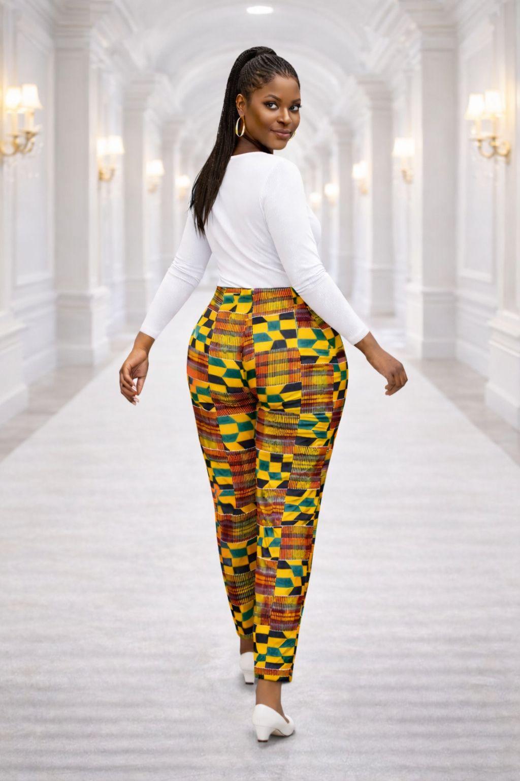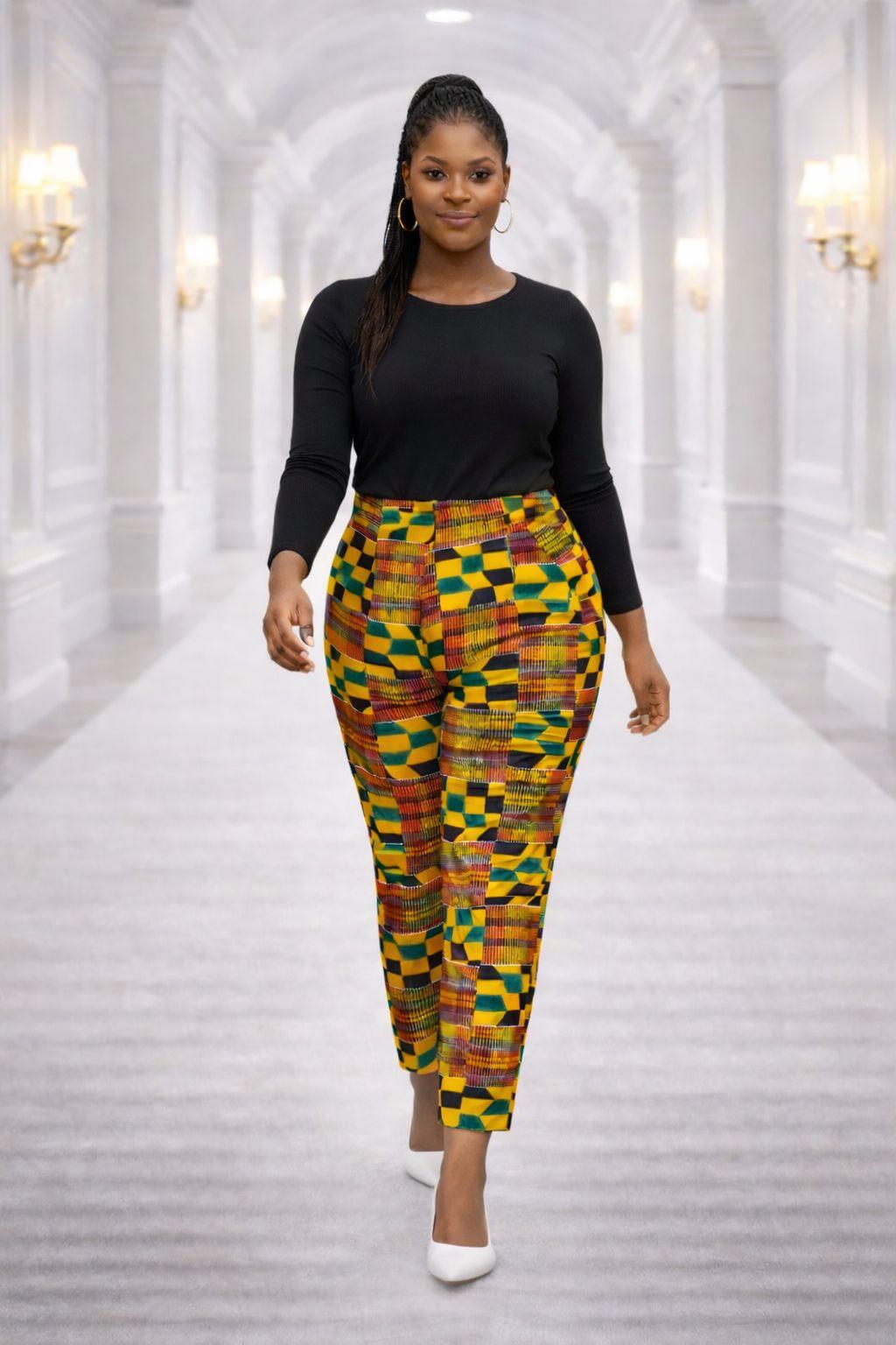 Add a vibrant, cultural touch to your professional and social wardrobe with these expertly tailored Kente print trousers. Featuring a rich, multicolored geometric pattern dominated by mustard yellow, forest green, and earthy red tones, these pants bring a modern edge to traditional African textile art.