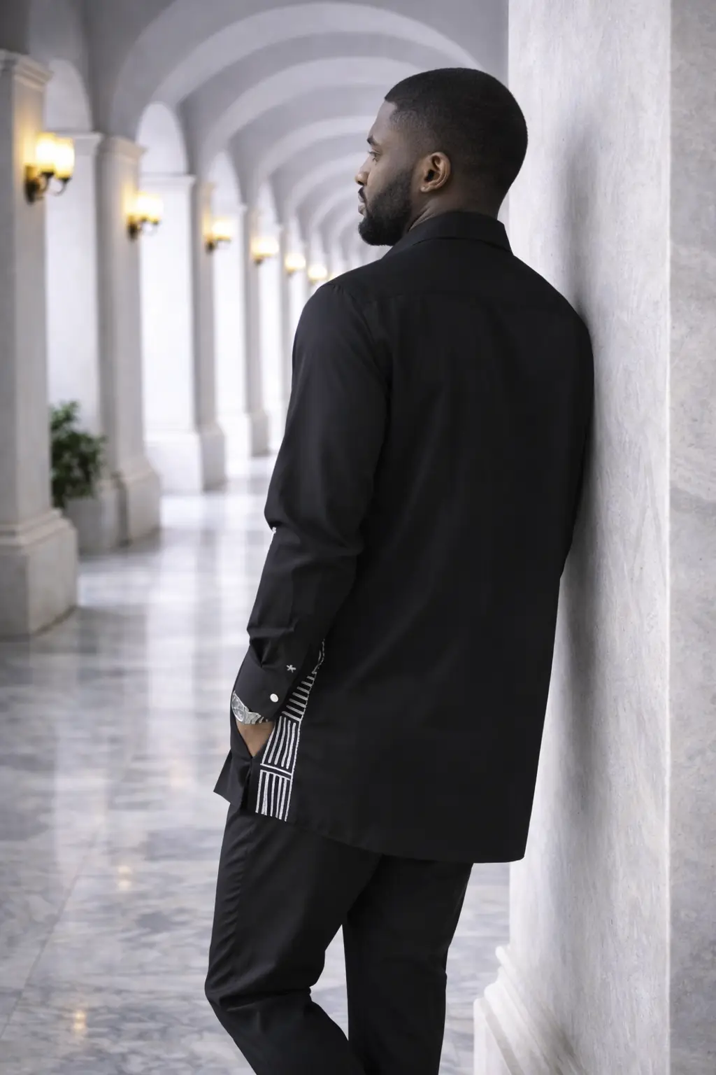 This African Print Black Set Long-Sleeve Shirt with Geometric White Pattern Panel & Trouser Set is designed for men who like their style clean, bold, and intentional. The long-sleeve shirt features a striking white geometric pattern panel that adds contrast and character, while the matching trousers keep the look balanced and sharp.