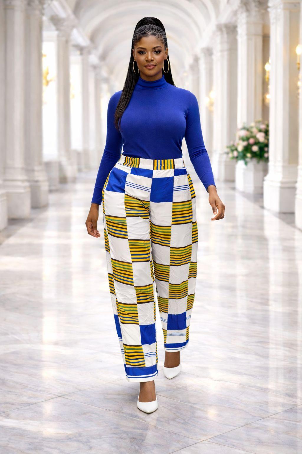 Bring a vibrant, structural element to your wardrobe with these striking African print trousers. Featuring a bold geometric block pattern in cobalt blue, mustard yellow, and crisp white, these pants offer a modern take on traditional Ankara textiles.