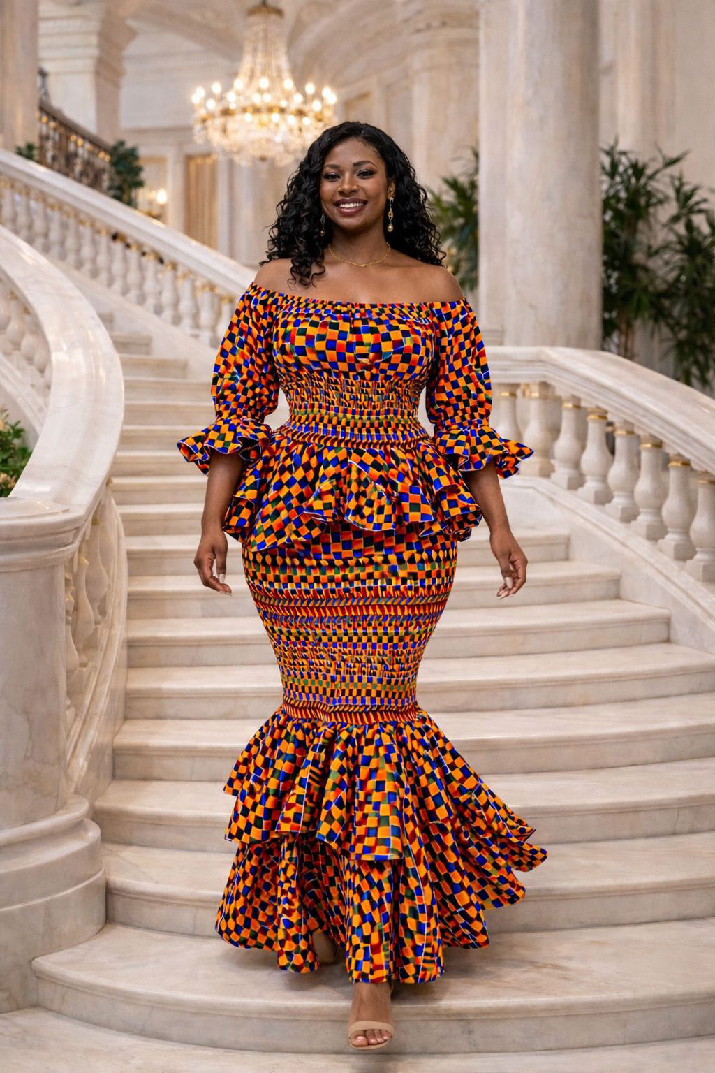 This gown is defined by its masterful use of texture and volume. The bodice and mid-section feature extensive smocking, which creates a beautifully gathered effect while providing a flexible, figure-hugging fit. The drama continues at the hem with a multi-tiered, ruffled mermaid skirt that adds incredible movement and a high-fashion finish to your walk.