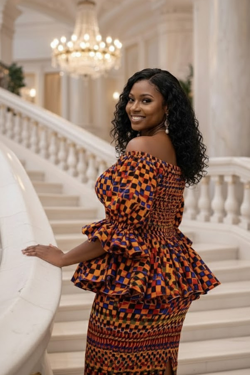 Crafted from 100% high-grade cotton wax print, the material offers a structured feel that holds the intricate ruffles and sleeve shapes perfectly. The fabric is naturally breathable, ensuring you stay comfortable during long celebrations. This premium Ankara cotton is known for its durability and color fastness, keeping the oranges and blues sharp and bright for years to come.