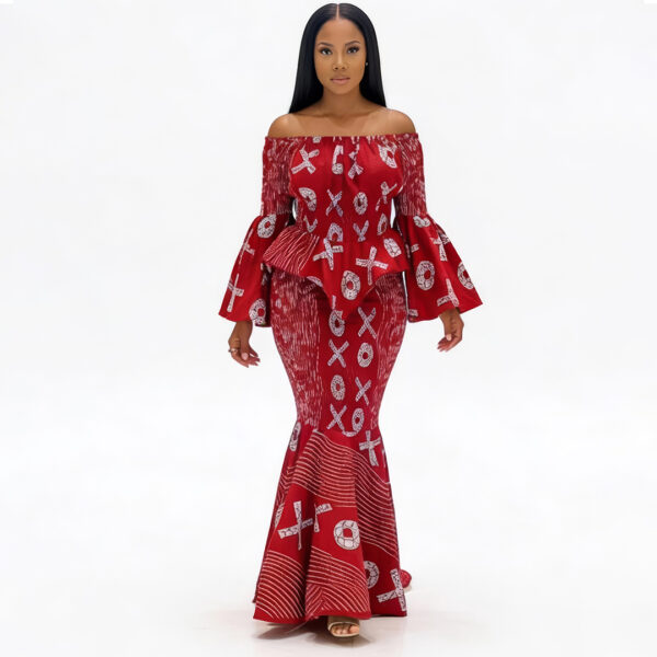 Bring a vibrant touch to your wardrobe with this stunning two-piece African print set. Crafted from high-quality, breathable cotton wax fabric, this ensemble features a rich red base adorned with striking white geometric patterns. The top is designed with an elasticated bardot neckline that sits comfortably across the collarbones, paired with dramatic flared sleeves and a structured peplum waist that defines your natural shape.