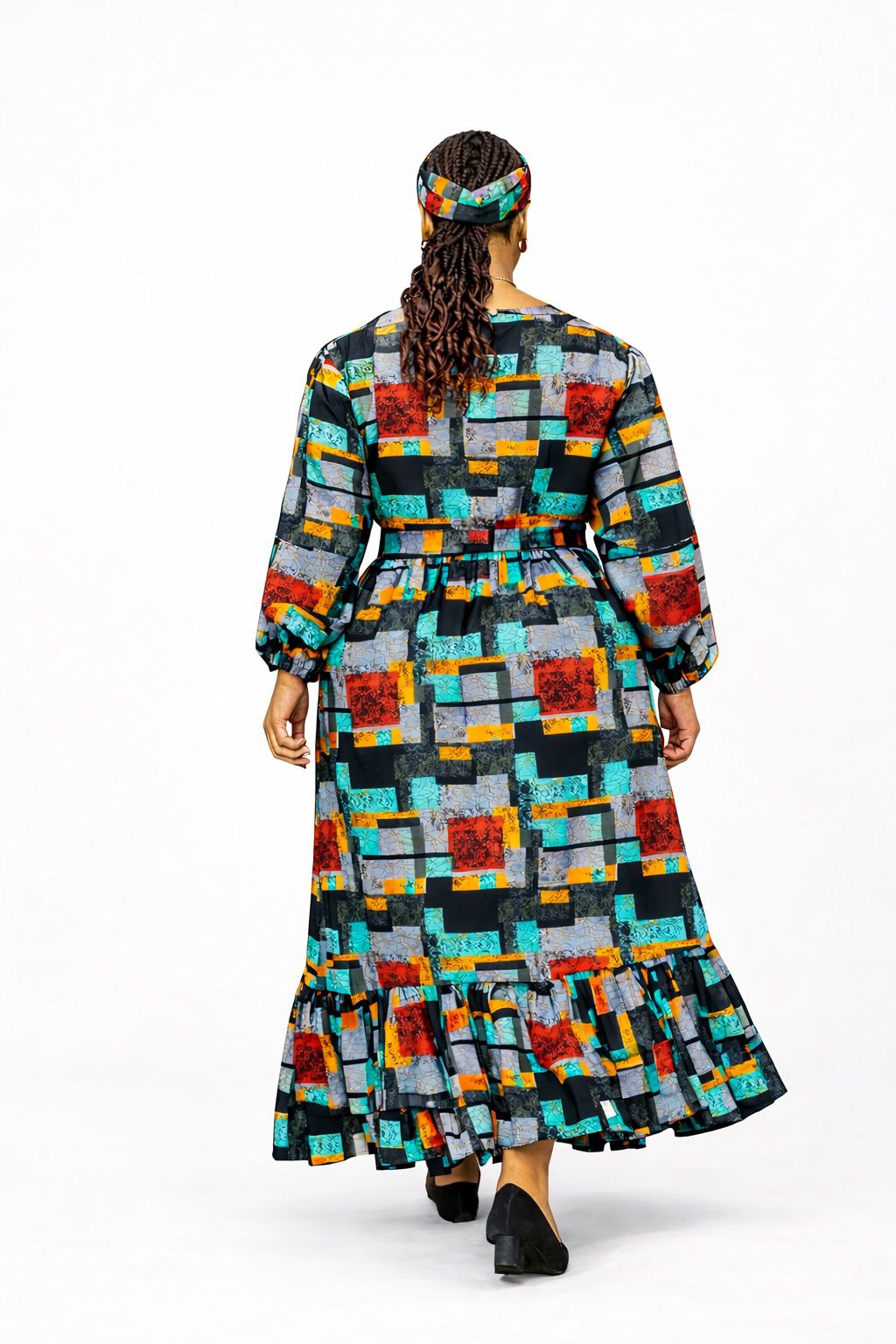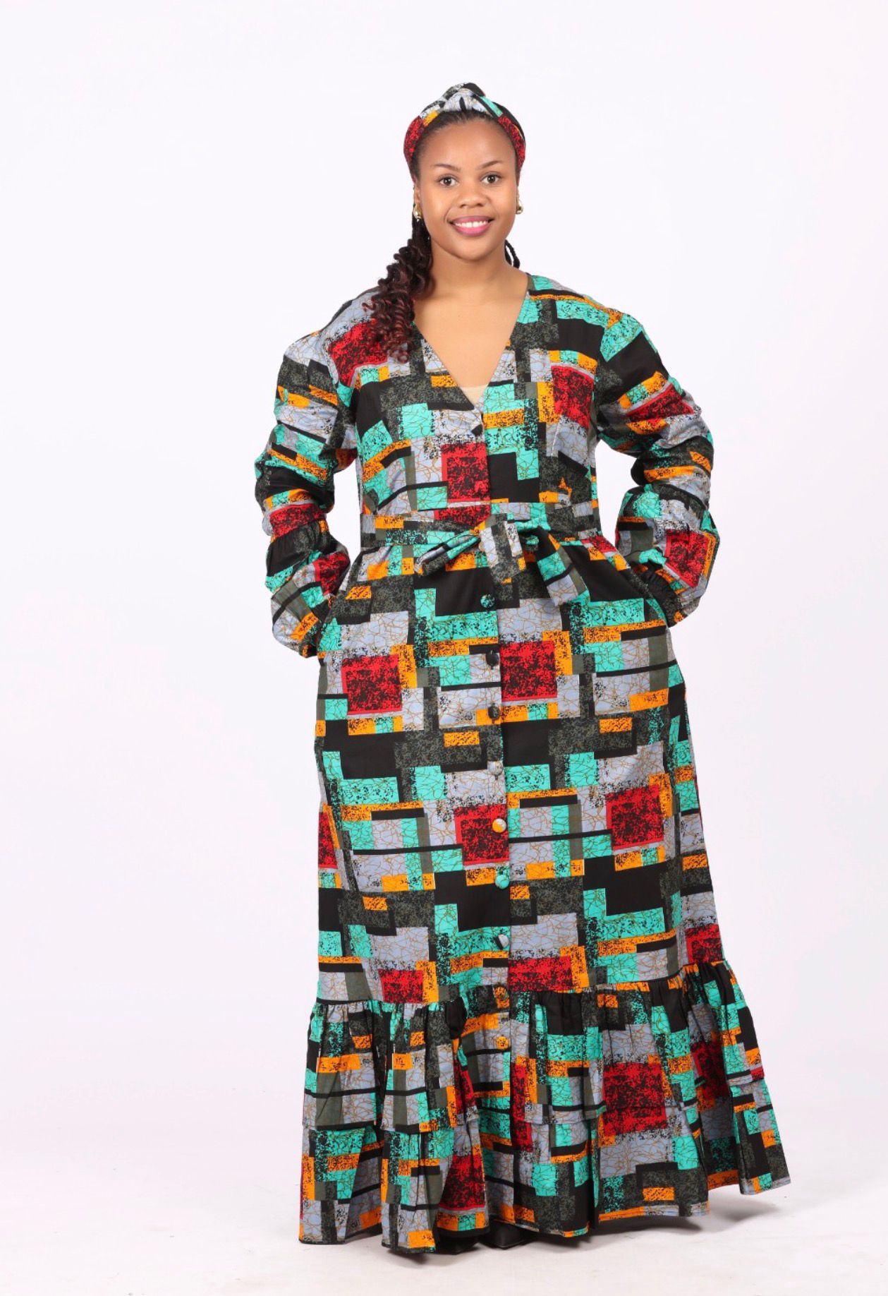 The design features a classic V-neckline and long sleeves, making it a versatile choice for shifting seasons. A matching tie-waist belt allows you to adjust the fit to your preference, while the functional button-down front adds a modern touch. The hem is finished with a wide flounce that creates beautiful movement as you walk. Whether you are attending a wedding, a cultural festival, or a garden party, this African fashion staple provides a grounded yet stylish aesthetic.