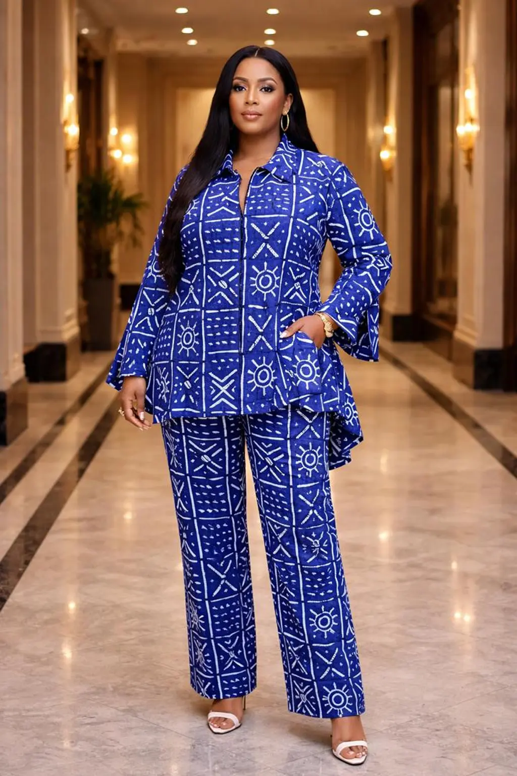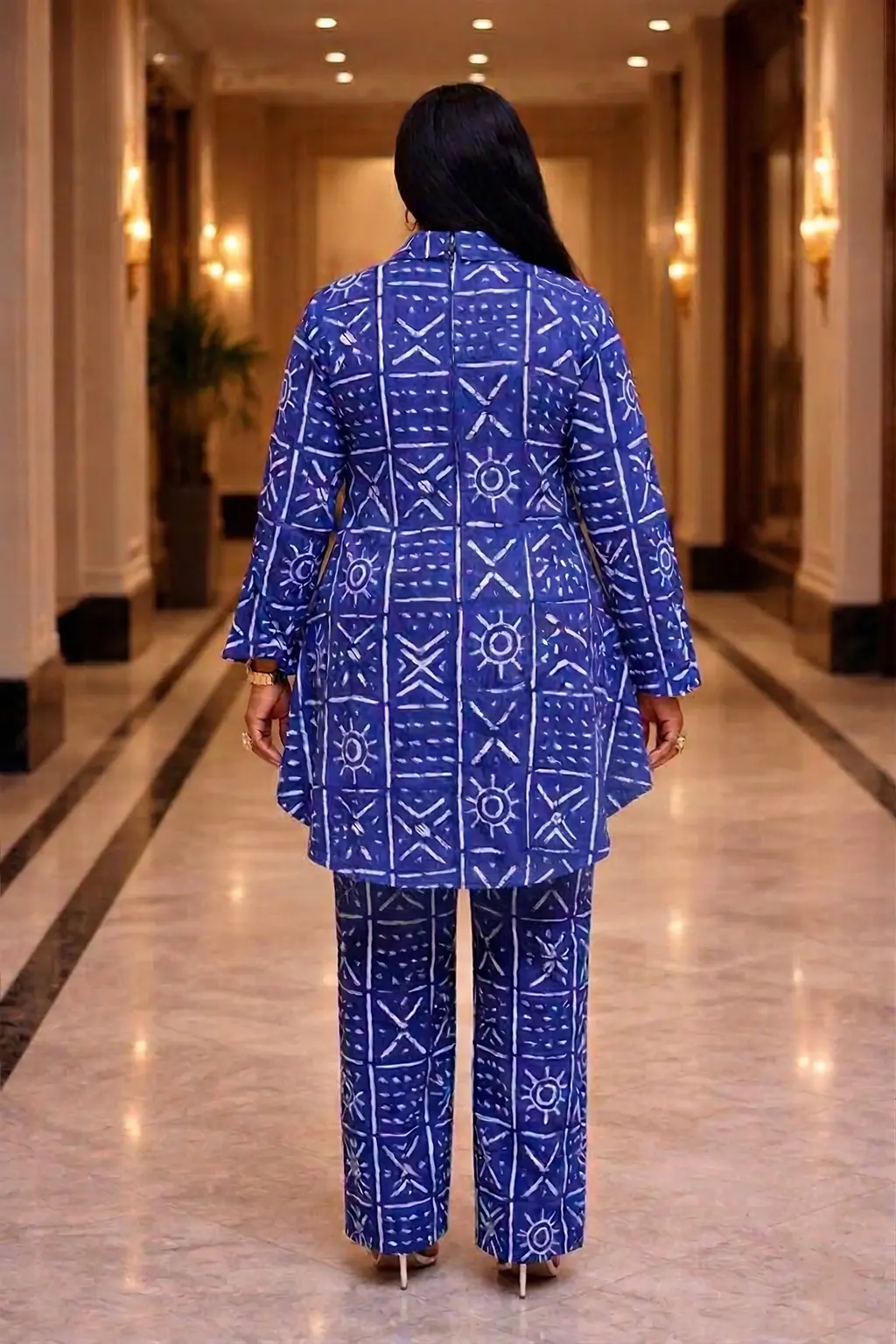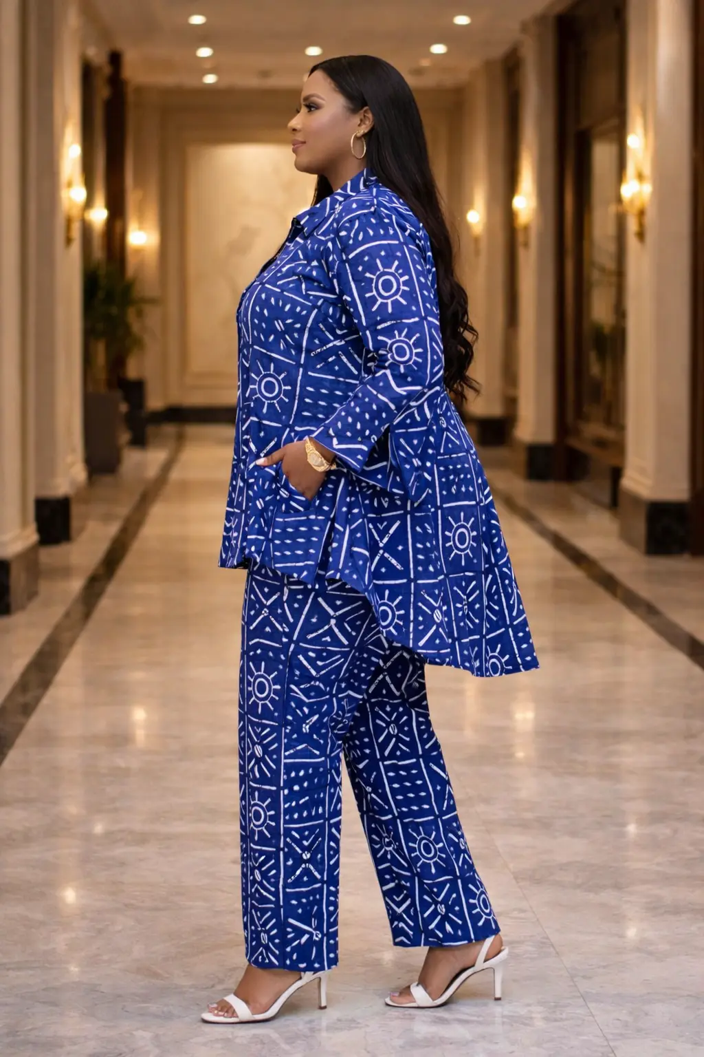 The Blue African Print Mudcloth Pant Set is a striking blend of ancestral patterns and modern tailoring. Featuring a deep cobalt blue base with crisp white geometric sun and line motifs, this two-piece ensemble is inspired by the iconic Bogolanfini textile traditions of West Africa.