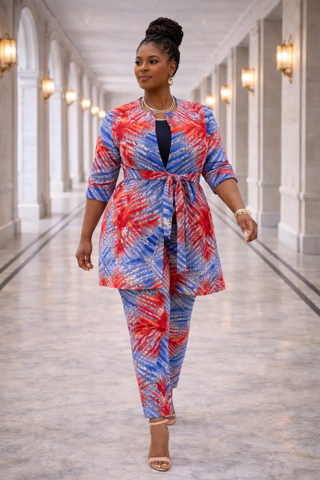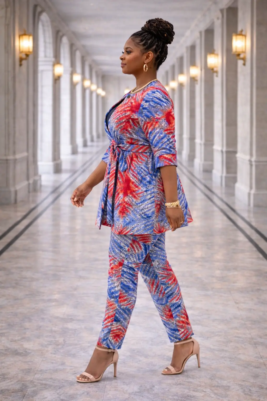 Bring a burst of energy to your professional and social wardrobe with our Blue and Red Adire Pant Set. This coordinated two-piece ensemble is handmade using traditional Adire tie-dye techniques on premium, breathable cotton. The striking sunburst pattern in deep crimson and cobalt blue ensures you stand out with an authentic, artisan-crafted look.