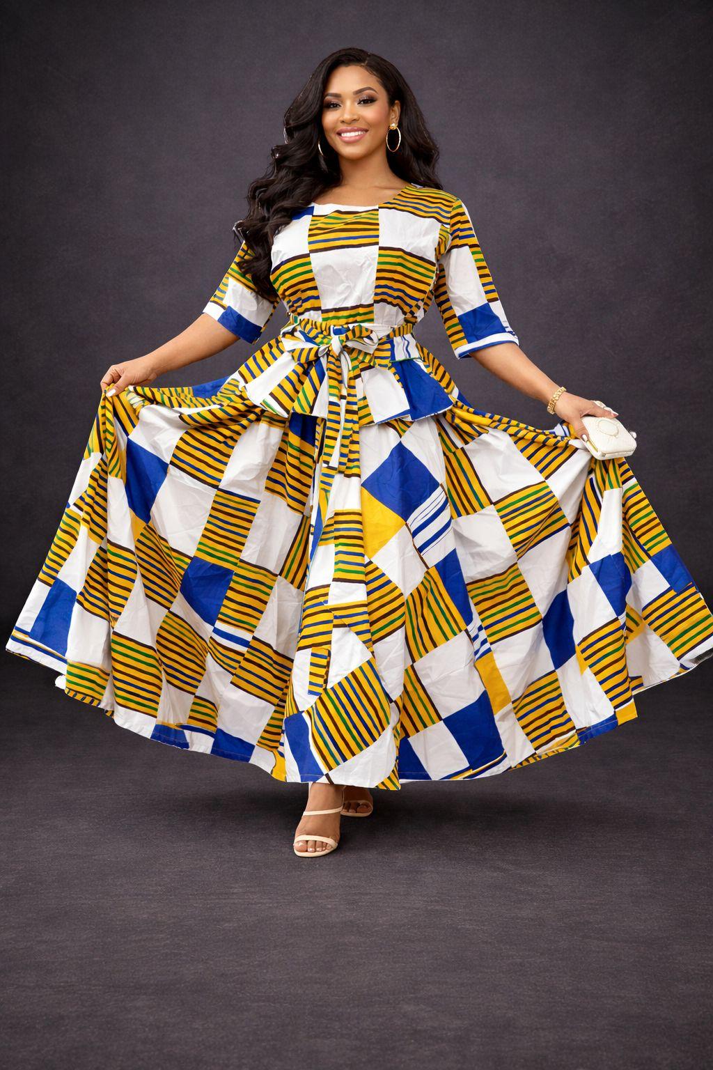 Bring a sense of classic artistry to your wardrobe with this stunning African print maxi dress. Featuring a bold, large-scale geometric pattern of blue and yellow blocks against a crisp white background, this dress is designed for those who appreciate traditional textiles with a contemporary edge.
