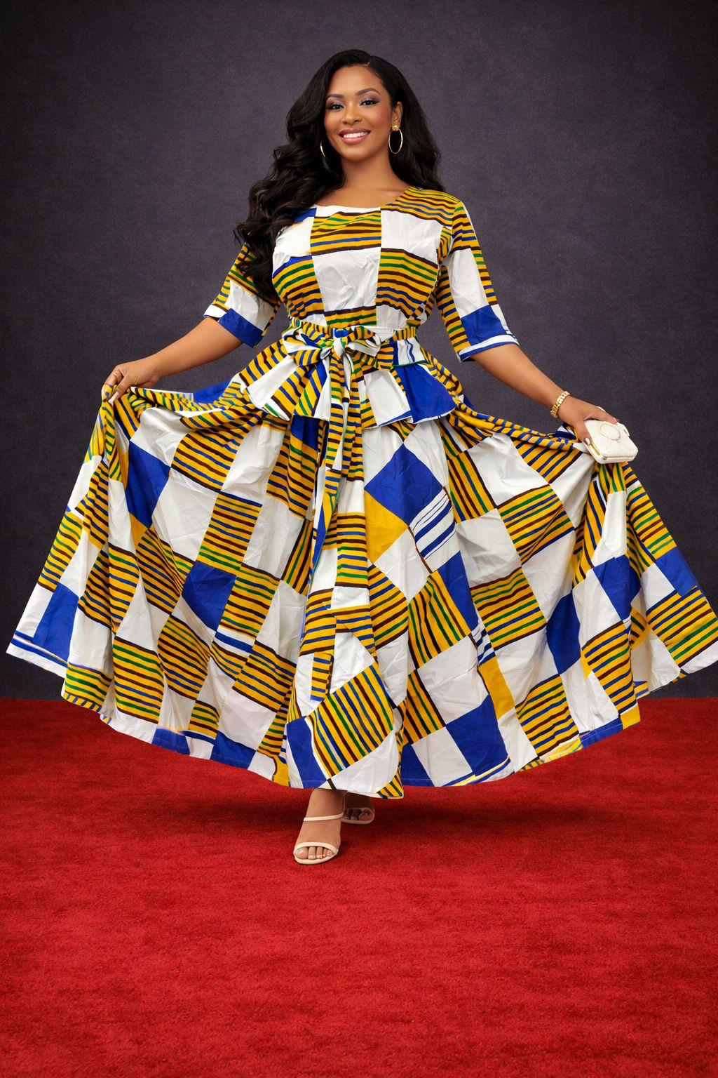 The pattern consists of alternating squares filled with rhythmic stripes and solid blocks of color. The structured bodice flows into a full, floor-length A-line skirt that provides graceful movement as you walk. A matching fabric belt allows you to cinch the waist for a tailored fit, while the mid-length sleeves offer a balanced, modest touch.