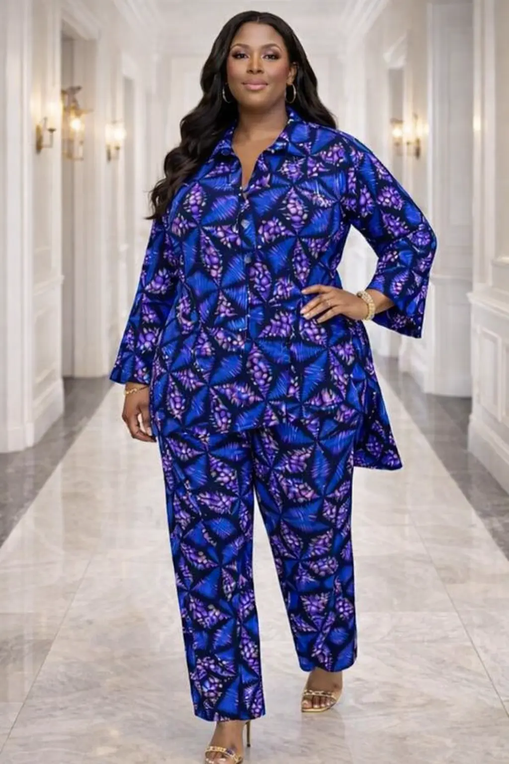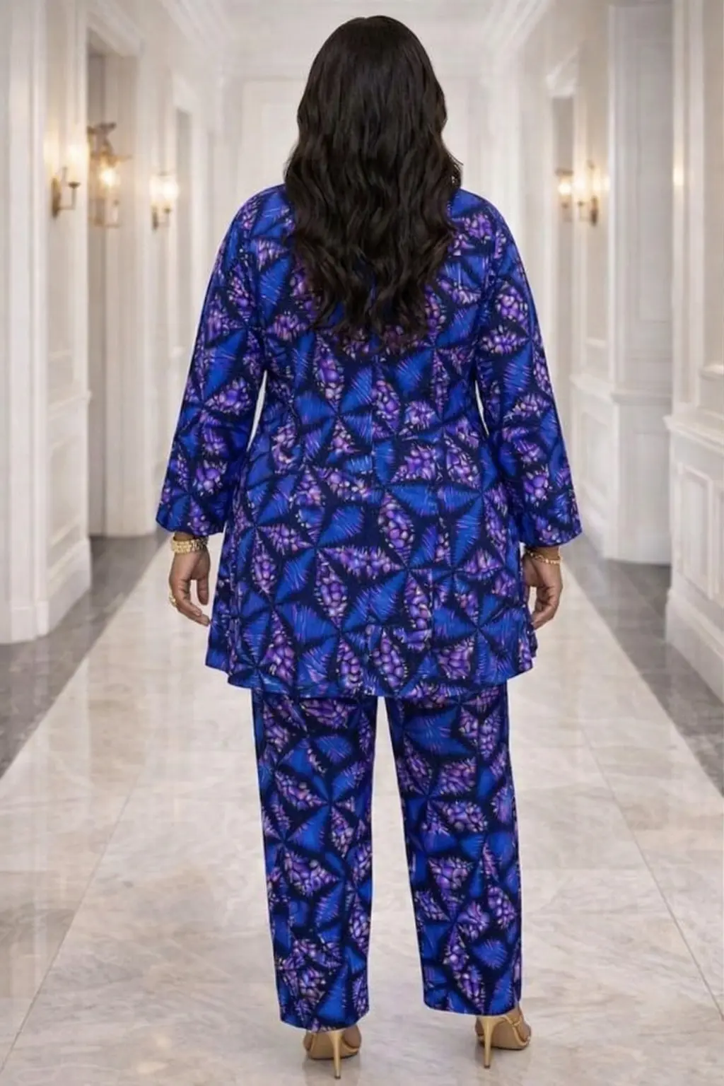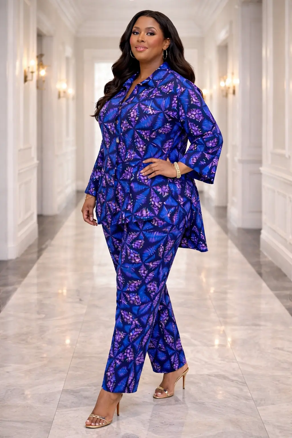 The Blue Butterfly Print Pant Set combines a rich, vibrant aesthetic with a relaxed, modern cut. This two-piece ensemble features a button-down tunic with a high-low hemline and matching straight-leg trousers, showcasing an intricate geometric butterfly pattern in shades of electric blue, indigo, and soft lilac.