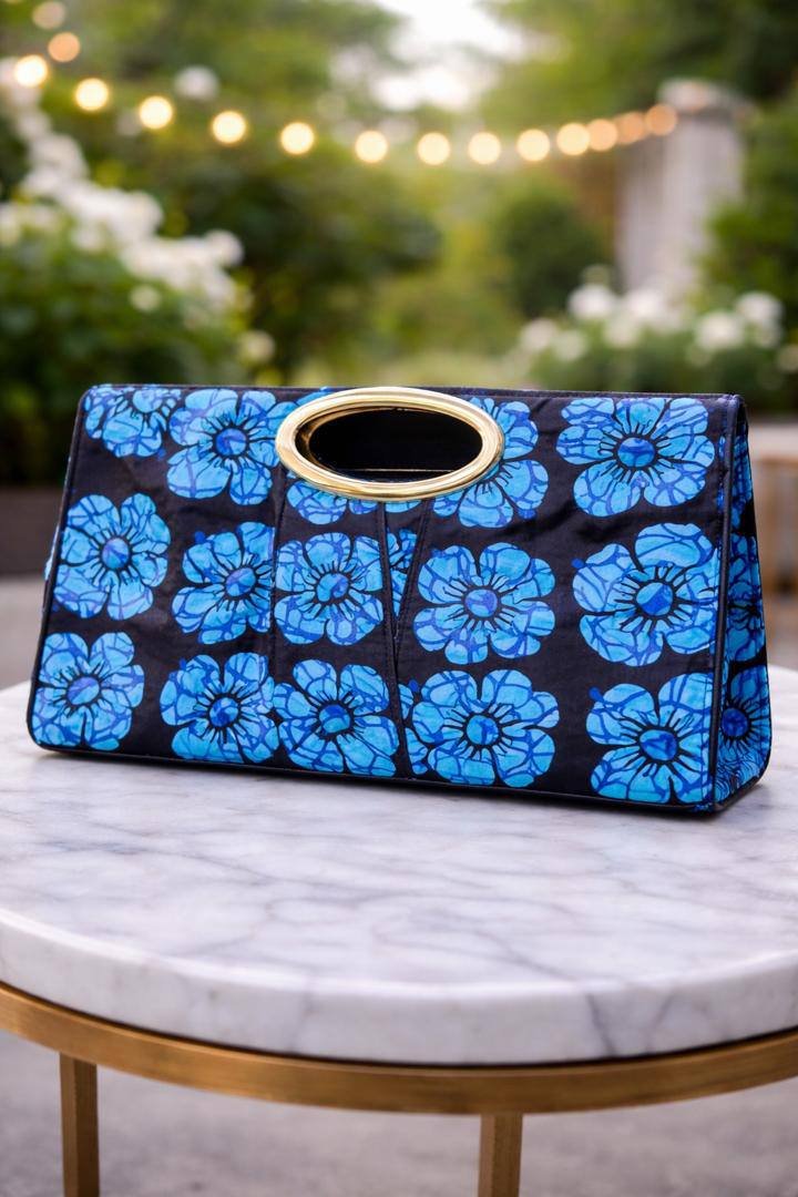 Step into effortless elegance with this stunning African print ensemble designed to turn heads. Featuring a flowing blue floral Ankara wrap skirt paired with a sleek fitted top and a matching statement clutch, this outfit blends tradition with modern sophistication.
