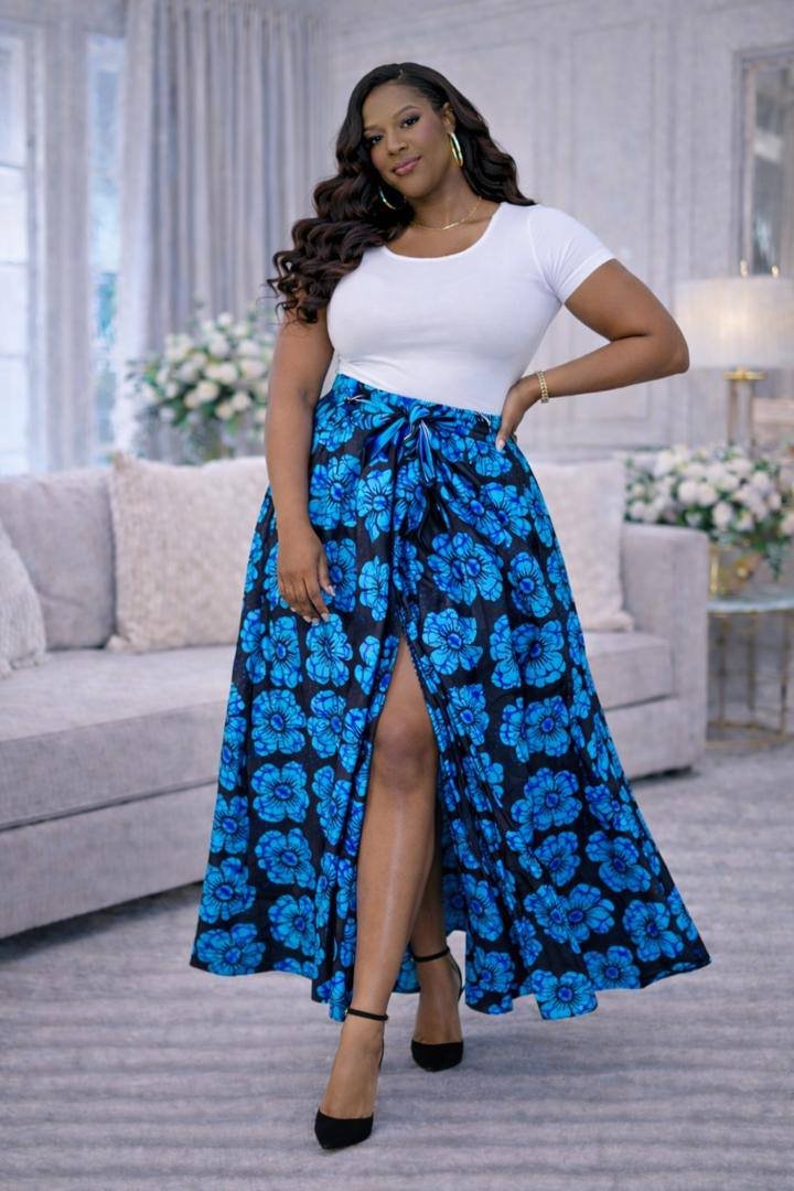 Flattering high-waist wrap design with adjustable fit Bold blue floral Ankara print that stands out beautifully Elegant flowy maxi length with a subtle front slit for movement Comes with a matching clutch bag for a complete, coordinated look Perfect for weddings, brunches, special events, and classy outings