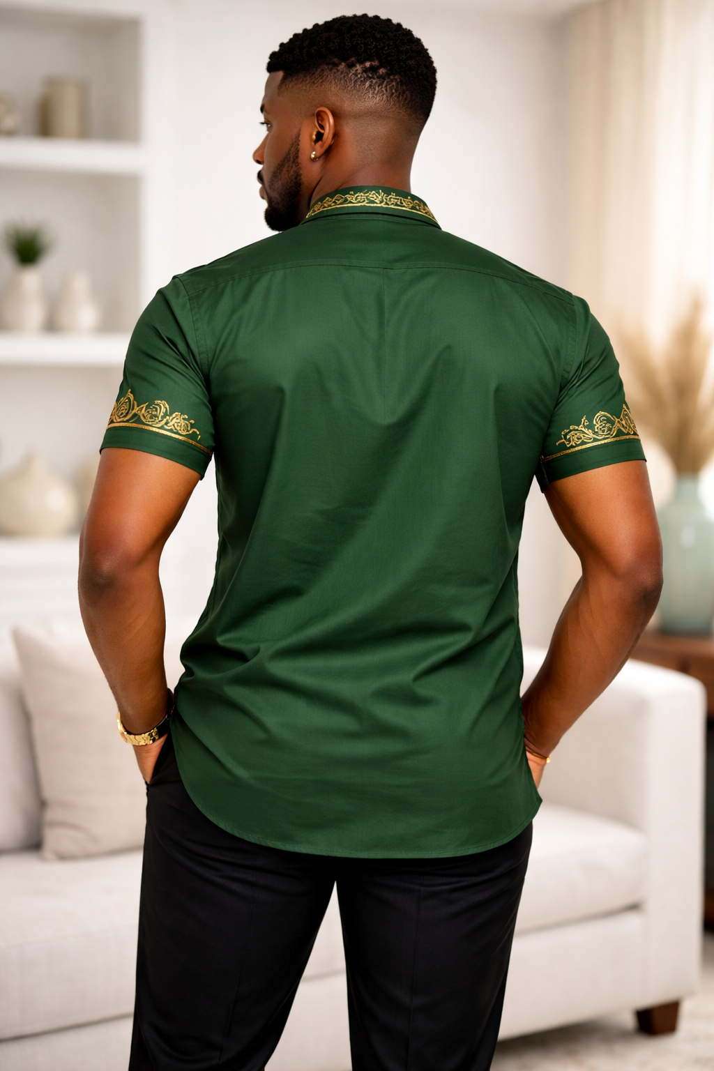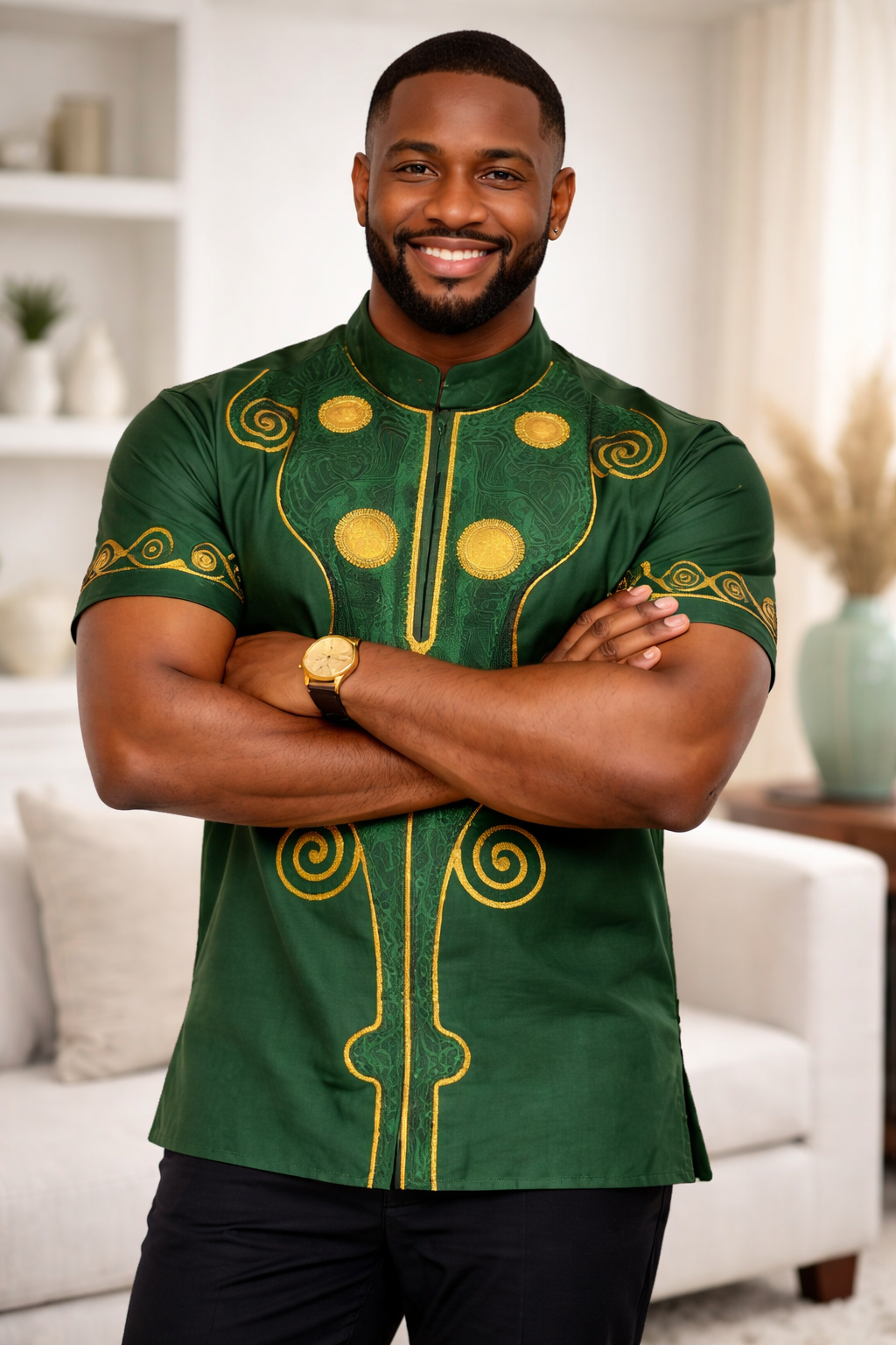 This forest green dashiki shirt offers a masterclass in understated luxury, featuring a deep, rich hue paired with intricate gold embroidery. The design utilizes a structured mandarin collar and a short-sleeve cut that balances traditional aesthetics with the needs of a modern wardrobe. The gold threadwork is meticulously applied in swirling patterns and circular motifs across the chest and sleeves, providing a vibrant contrast that catches the light beautifully.