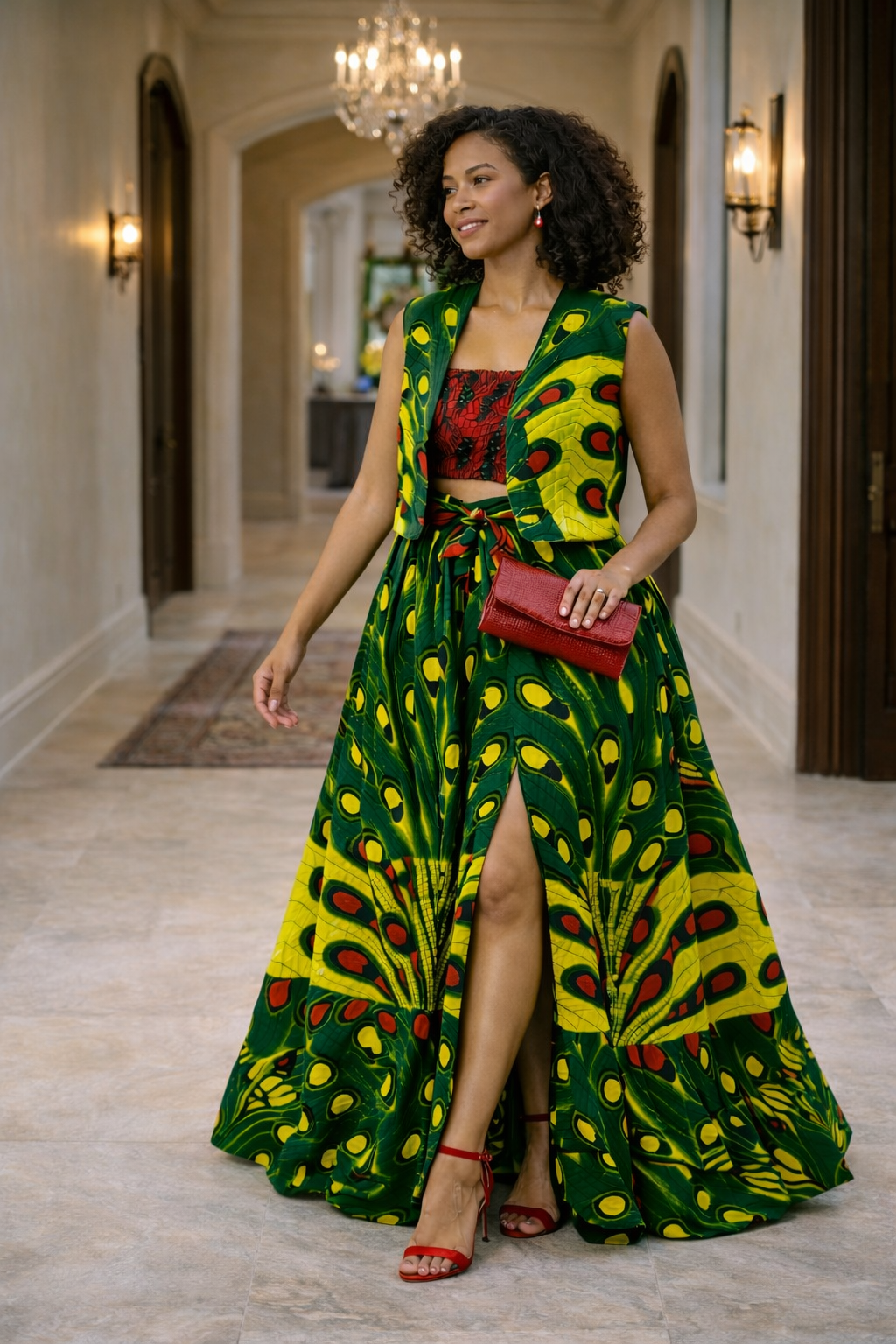 The set is completed by a coordinating red and black patterned boob-tube style crop top that sits comfortably beneath the vest. The high-waisted maxi skirt is designed with a dramatic thigh-high side slit, allowing for graceful movement and a breezy feel during outdoor events.