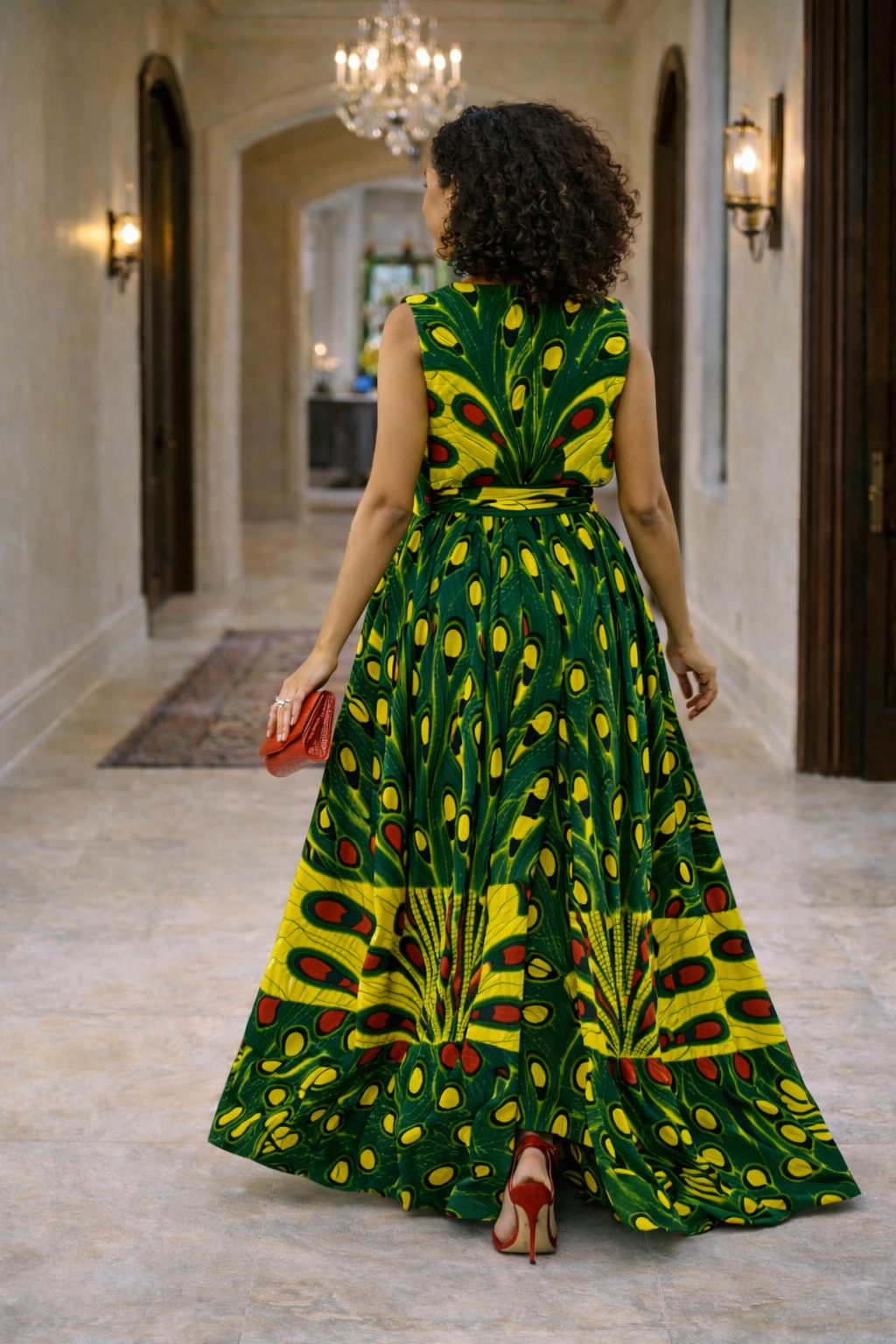 Bring a nature-inspired artistry to your formal wardrobe with this striking three-piece coordinating set. The ensemble features a structured, sleeveless cropped vest and a floor-sweeping maxi skirt, both showcasing a vivid peacock feather print. Deep forest green tones are layered with bright yellow and bold red “eye” motifs to create a visually dynamic look that honors traditional patterns with a modern edge.