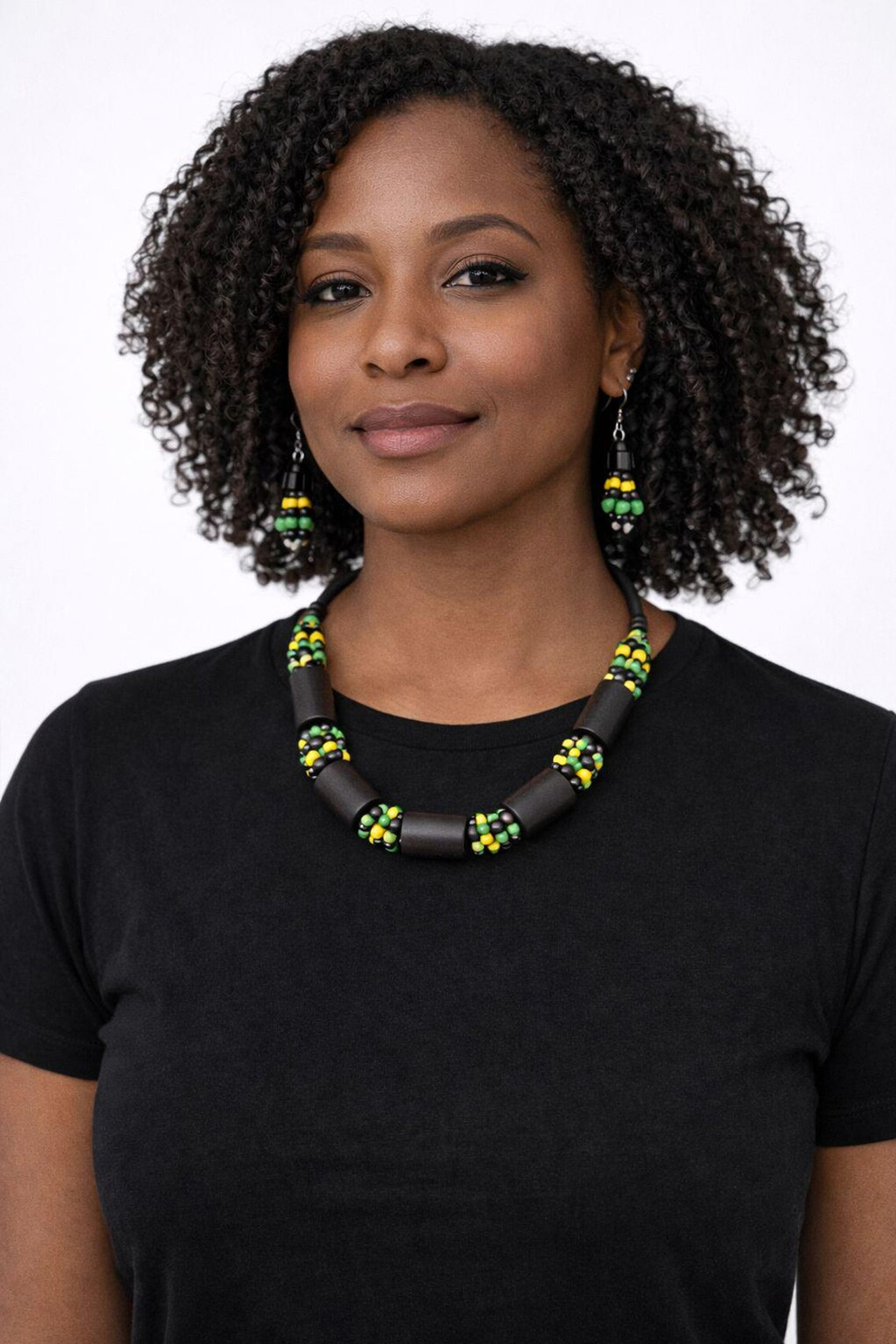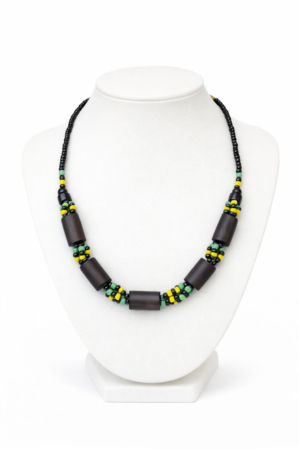 Ground your style with the natural textures of this hand-strung African bead necklace. This piece features high-quality, smooth dark wood cylinders that provide a substantial, earthy feel without being heavy. Between each wooden section, clusters of vibrant green, yellow, and black glass seed beads create a rhythmic pattern that draws the eye and adds a pop of color to neutral outfits.