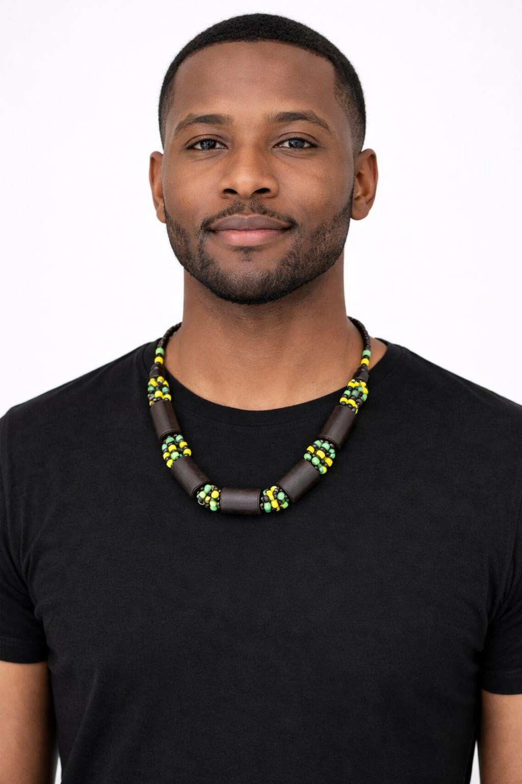 Designed for those who appreciate artisanal craftsmanship, this necklace sits comfortably at a mid-length drop, making it easy to layer over a simple tee or nestle under a collared shirt. The materials are selected for durability and comfort, ensuring the beads feel smooth against the skin throughout the day. The color palette—inspired by traditional Pan-African tones—makes it a meaningful accessory for cultural festivals, Black History Month events, or simply as a signature daily piece.