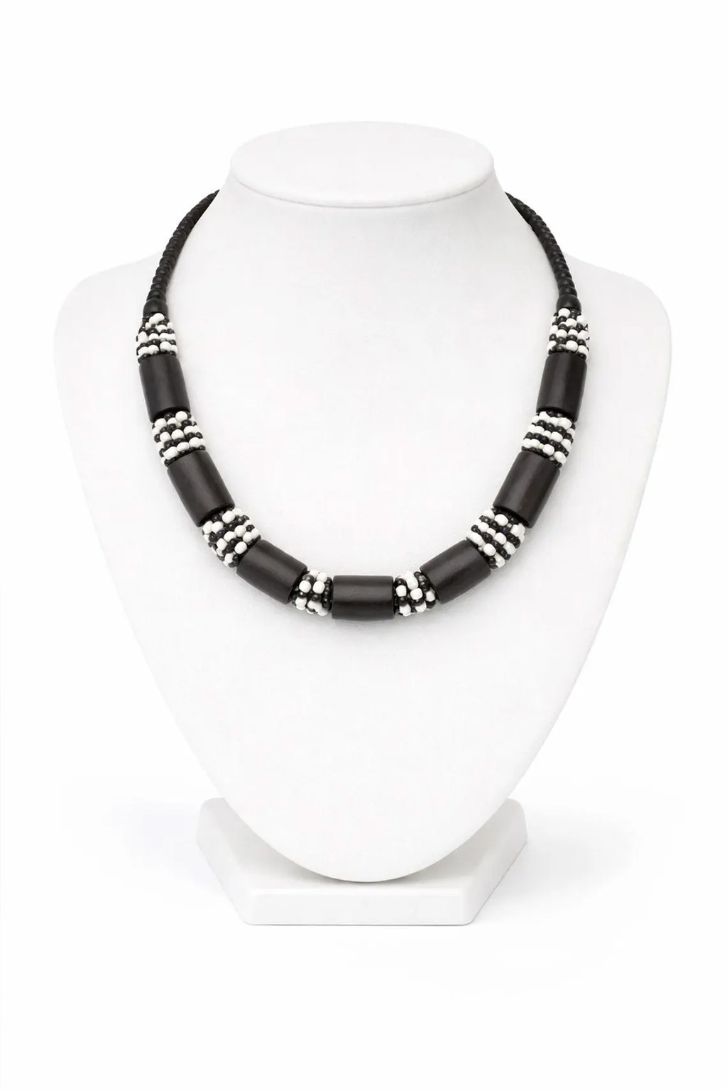 This striking monochrome necklace brings a grounded, earthy feel to your jewelry collection. It features a rhythmic arrangement of smooth, matte-finish black resin cylinders separated by clusters of small black and white glass seed beads. The contrasting color palette ensures it stands out against any outfit, while the classic pattern keeps it grounded in timeless style.