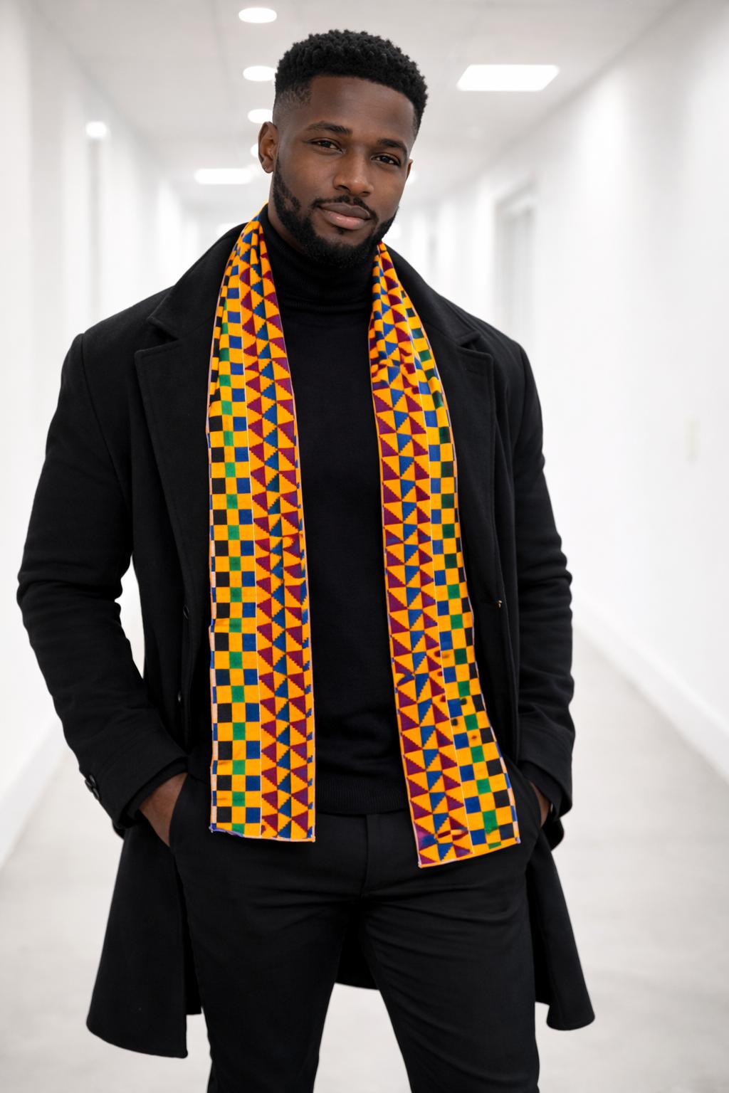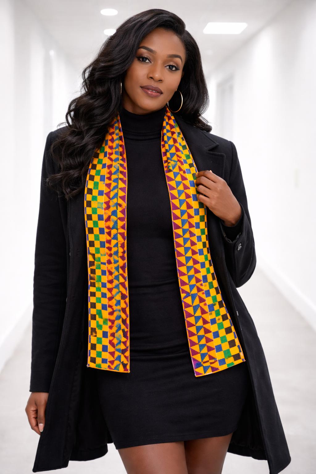 Bring a piece of West African tradition to your daily rotation with this vibrant Kente print scarf. This accessory features the iconic geometric weaving patterns synonymous with Ghanaian heritage, rendered in a classic palette of sun-drenched gold, deep forest green, and earthy maroon. It serves as a meaningful connection to culture while functioning as a sharp, modern accessory for any wardrobe.