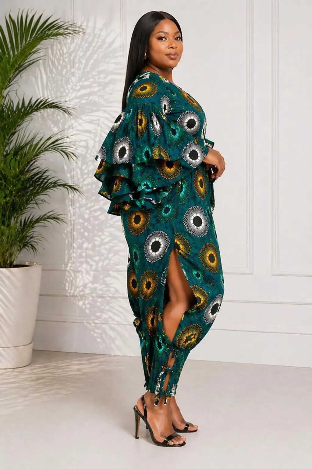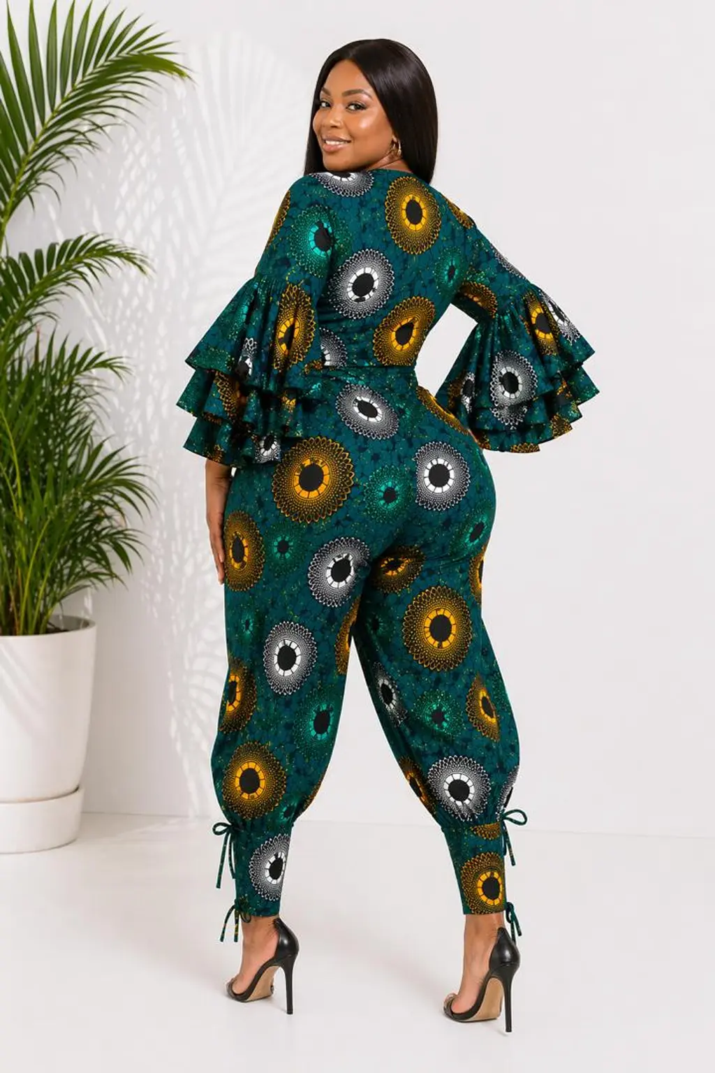The Kemi Emerald African Print Pants Set blends deep, forest-toned artistry with a bold, contemporary cut. This coordinated two-piece features a mesmerizing “record” or “sun” motif in earthy amber and crisp monochrome tones, set against a rich emerald green backdrop. Crafted from 100% authentic African wax cotton, the fabric offers a premium, structured feel that ensures the architectural details stay sharp throughout the day.
