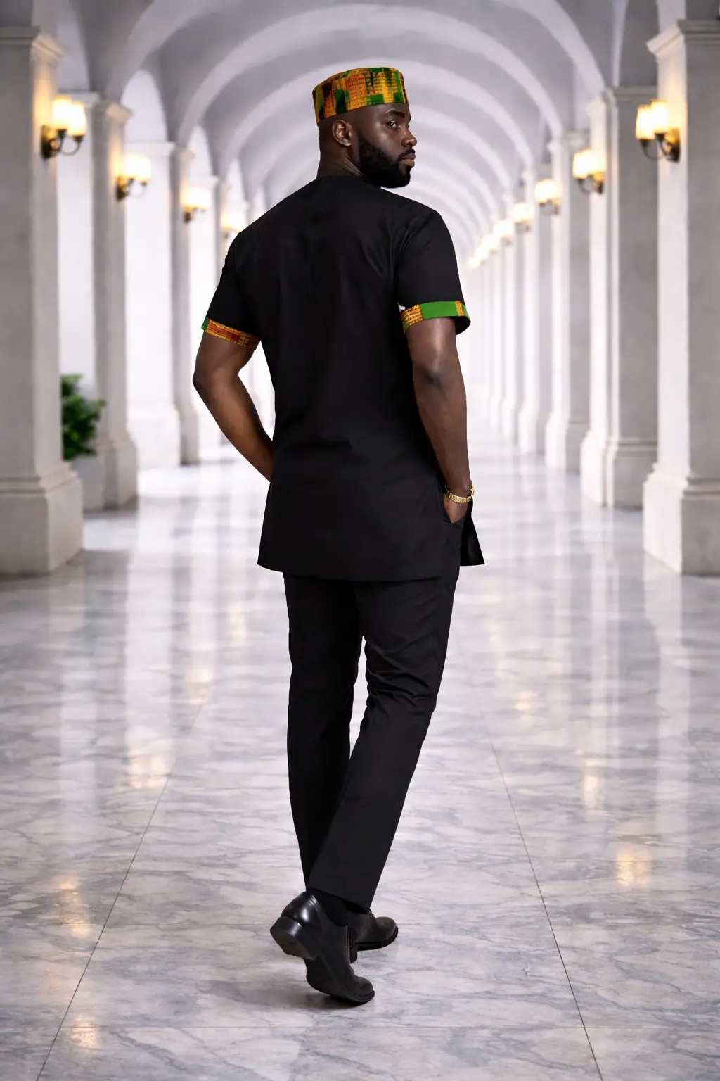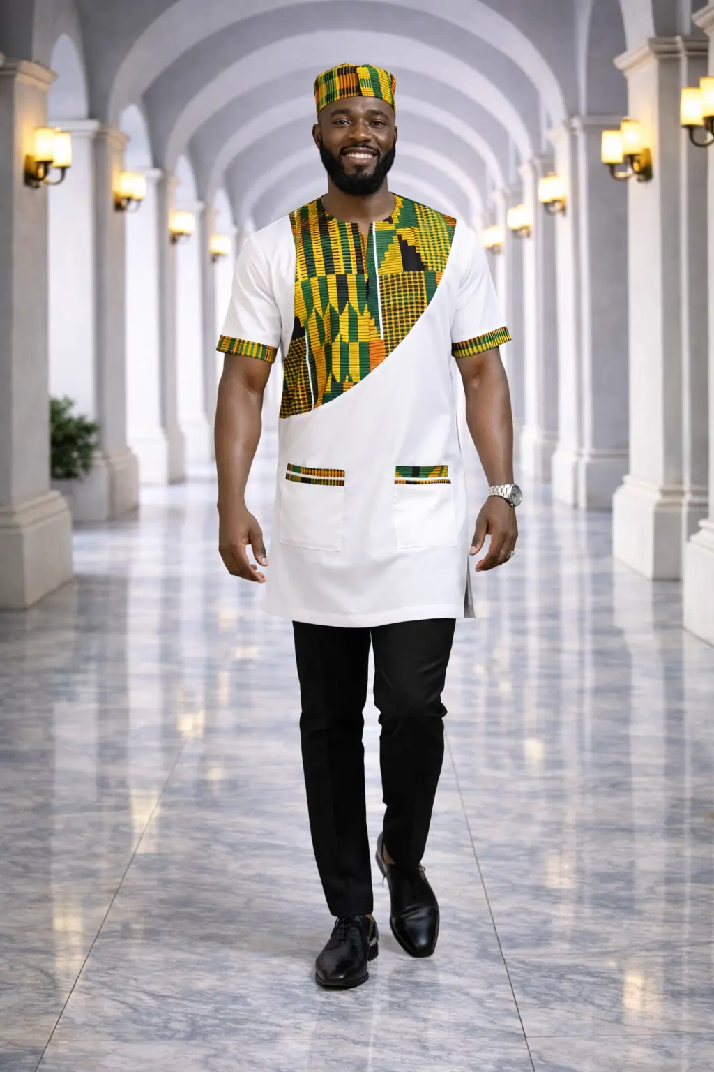 - Asymmetrical Kente Panel: A hand-selected geometric print overlay that brings a burst of color to a minimalist base.