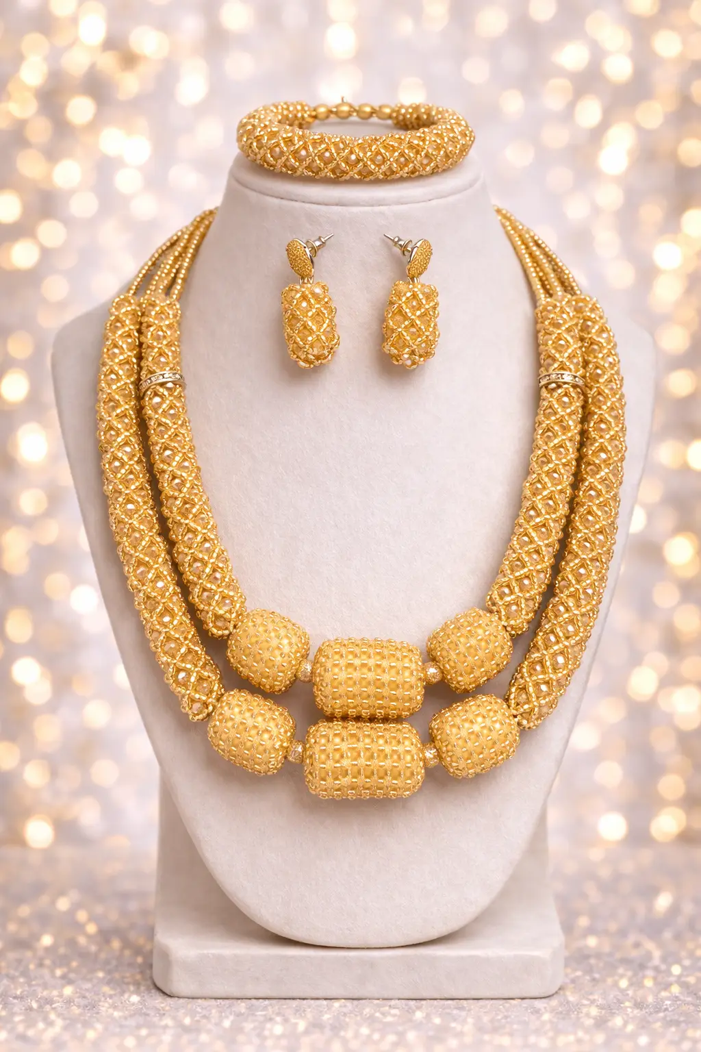 The necklace combines intricate bead patterns and structured segments that sit comfortably around the neckline. Each element reflects detailed craftsmanship, giving the piece depth and a rich visual texture. The matching earrings and bracelet complete the look, making it easy to style the entire set together or wear the pieces individually.