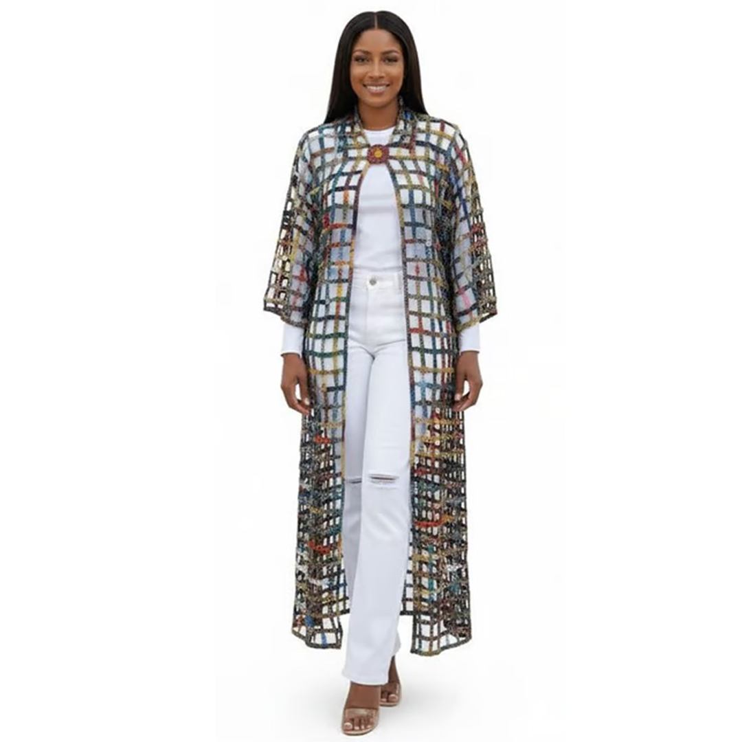 This striking piece is more than just a layer; it is a wearable work of art. Designed with a unique open-weave, checkered pattern, this longline kimono cardigan features a vibrant mix of earthy tones and cool blues. The mesh-like construction provides a lightweight, breathable feel, making it an ideal choice for transitioning between seasons or adding texture to a simple outfit.