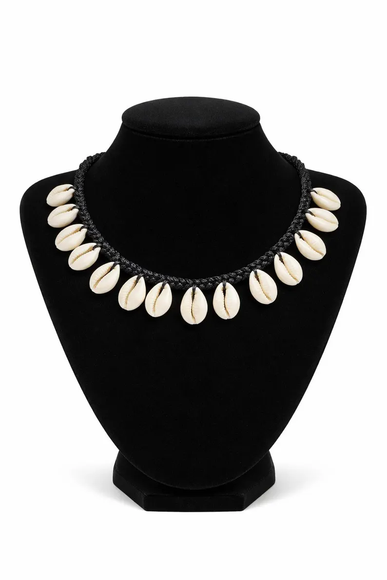 Bring a piece of the ocean to your jewelry box with this handcrafted cowrie shell choker. This necklace features a row of polished, cream-colored shells securely set against a thick, hand-woven black cord. Unlike mass-produced plastic alternatives, these are genuine shells, giving each piece a unique shape and a natural, grounded feel.