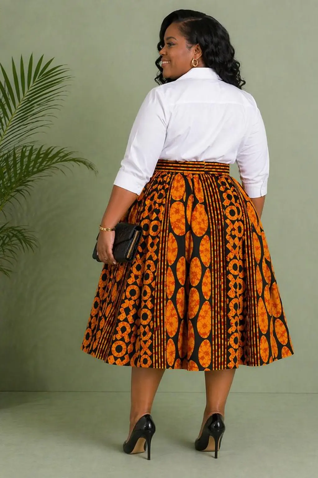 Designed with a focus on ease and grace, this midi skirt features a structured waistband with a matching tie-belt, allowing you to secure the fit exactly where you like it. The pleated design adds a graceful volume that moves naturally as you walk, hitting just below the knee for a polished look. Whether you are styling it for the office with a crisp white button-down or pairing it with a simple tee for a weekend brunch, this African print piece offers a reliable blend of comfort and cultural flair.