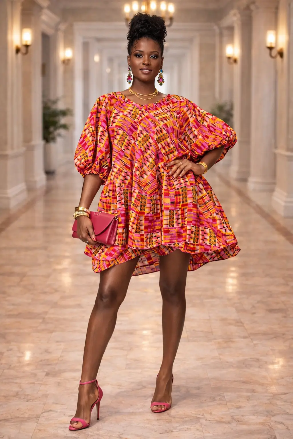 Vibrant Kente-Inspired Print: Intricate geometric patterns in pink and orange tones for a culturally rich aesthetic.