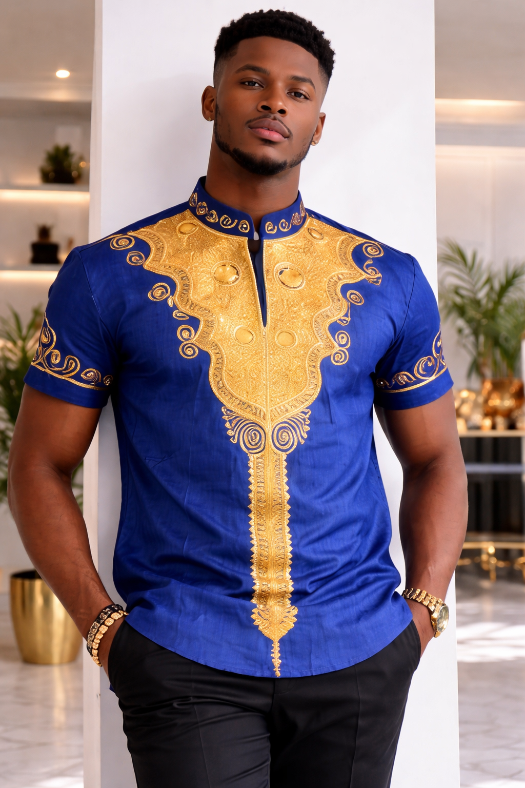 This contemporary take on traditional attire features a vibrant royal blue base accented by intricate gold embroidery. The design centers around a classic mandarin collar and a short-sleeved cut, merging heritage-inspired patterns with a modern, tailored fit. The metallic gold threadwork flows across the chest and sleeve cuffs, creating a high-contrast look that feels both regal and grounded.