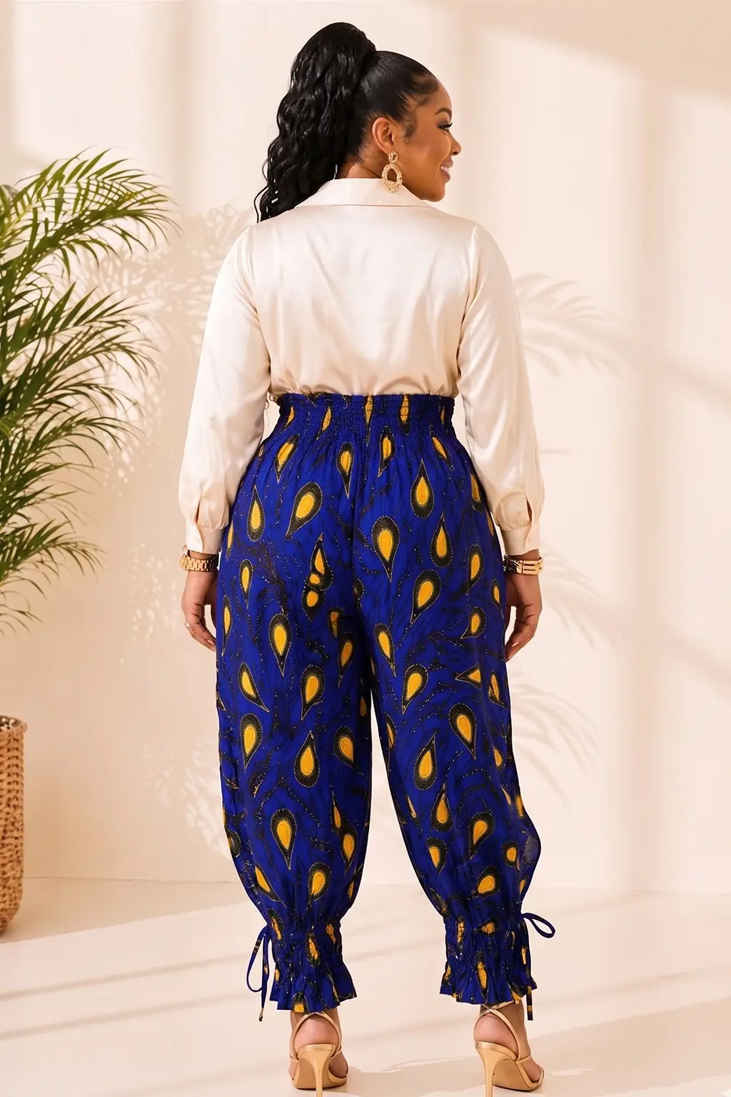 The Royal Opeyi African Print Balloon Pants represent a masterful blend of cultural symbolism and cutting-edge tailoring. Featuring the iconic “Peacock Eye” motif in a vibrant Royal Blue and sun-gold contrast, these pants are crafted from 100% premium African wax cotton. The high-density fabric provides a crisp, high-end structure that ensures the dramatic balloon shape stays perfectly defined throughout your day.