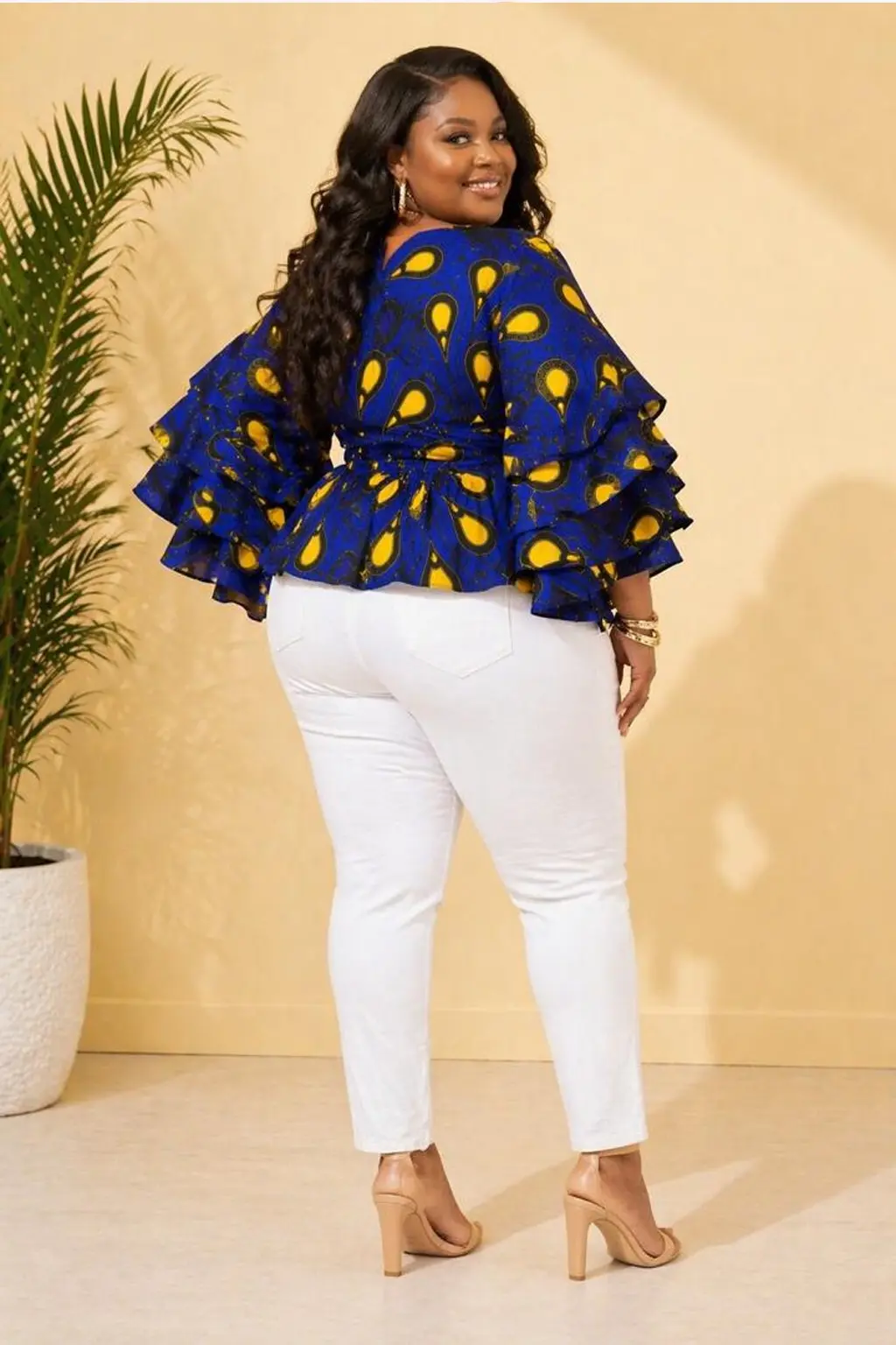 Designed for a personalized fit, this African print piece features a functional wrap-around closure and a deep V-neckline. The adjustable tie-waist allows you to cinch the midsection to your preference, providing a secure and tailored feel. The three-layered ruffle sleeves add a rhythmic movement and visual depth, making it an ideal choice for high-profile social events, cultural ceremonies, or a polished afternoon brunch.