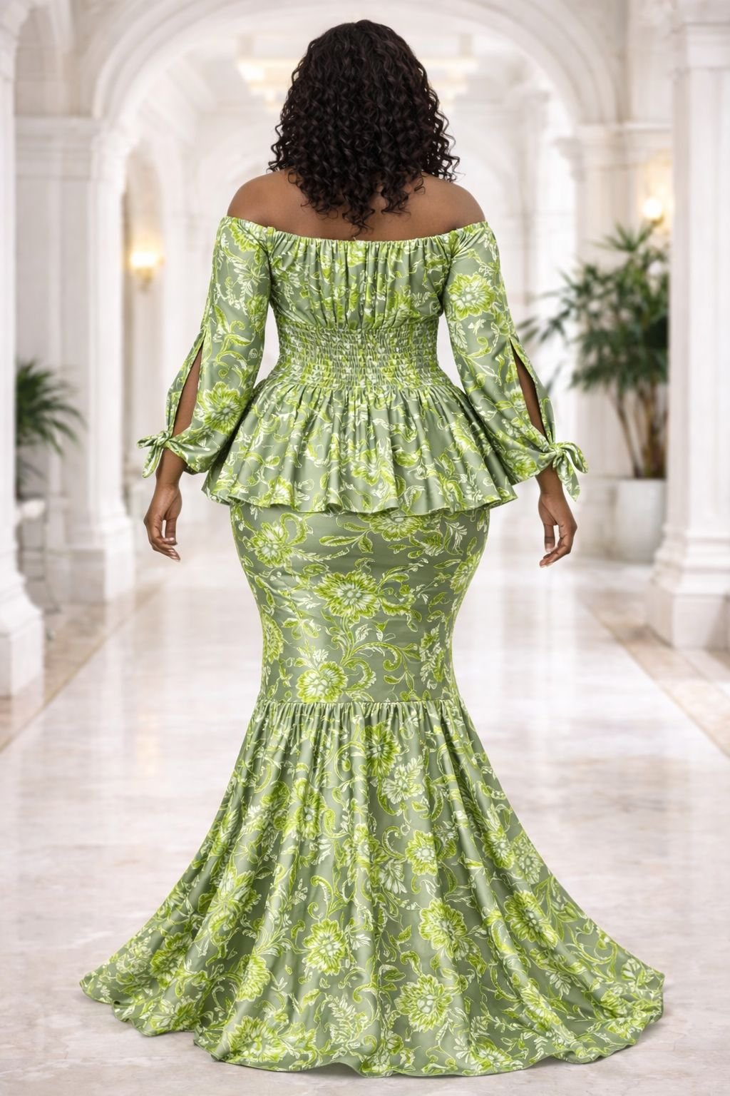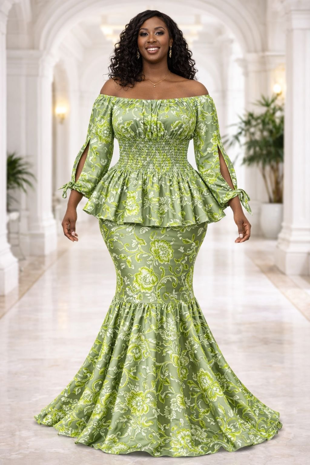 Refresh your formal wardrobe with this vibrant two-piece set featuring a rich sage green and cream botanical print. The top is designed with a wide neckline that highlights the collarbone, paired with a heavily smocked bodice for a secure, tailored fit through the waist. The peplum flare adds a rhythmic movement to the midsection, while the long sleeves feature stylish split details and adjustable ties at the wrists.