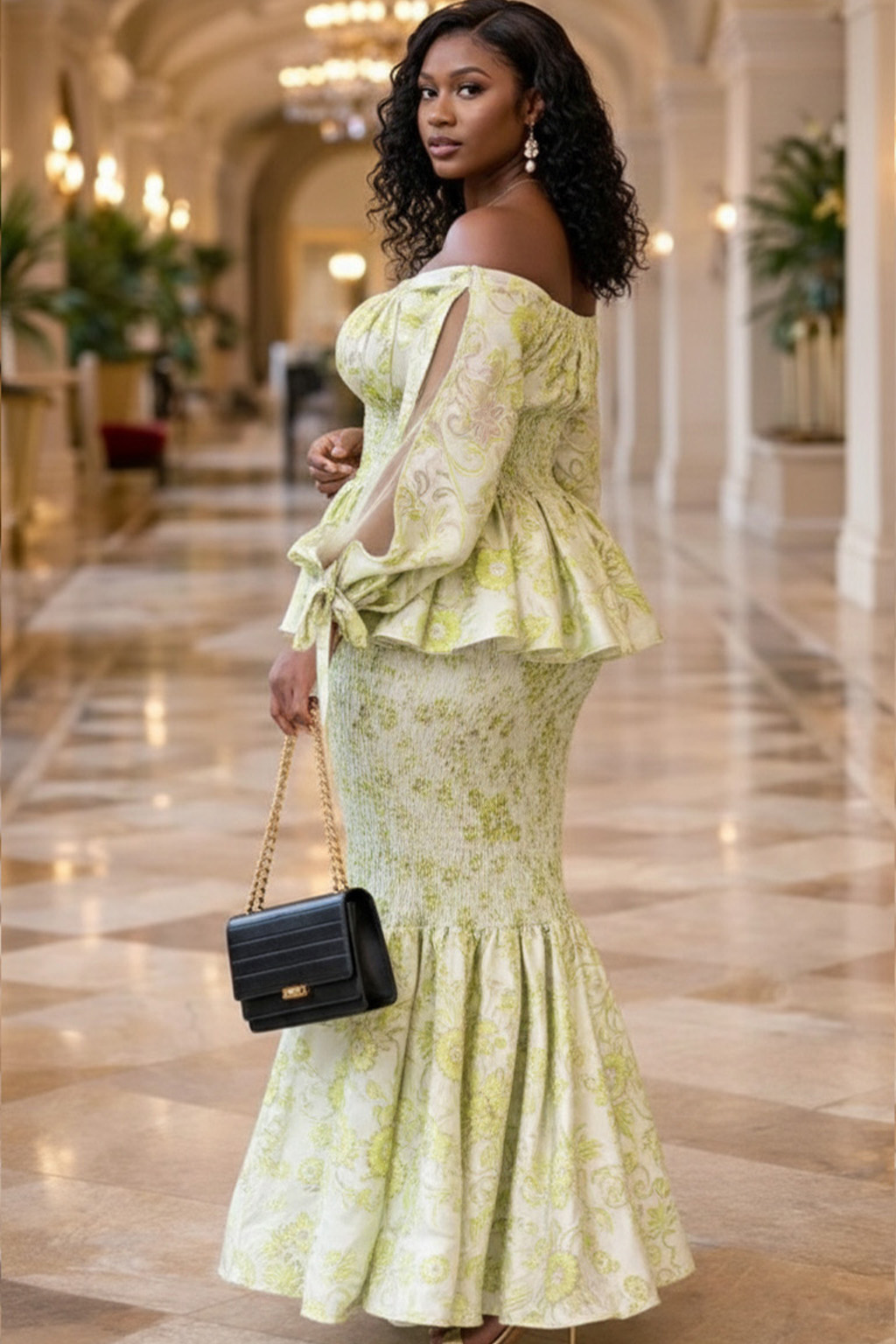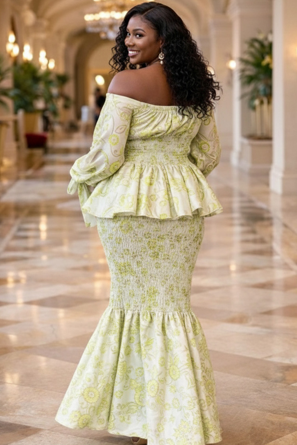 The matching high-waisted maxi skirt creates a continuous line, hugging the hips with smocked fabric before opening into a generous floor-length ruffle. Crafted from a breathable, lightweight material, this set is designed for comfort during long events. The subtle yellow and green floral pattern creates a polished look that pairs well with gold jewelry and a simple clutch.