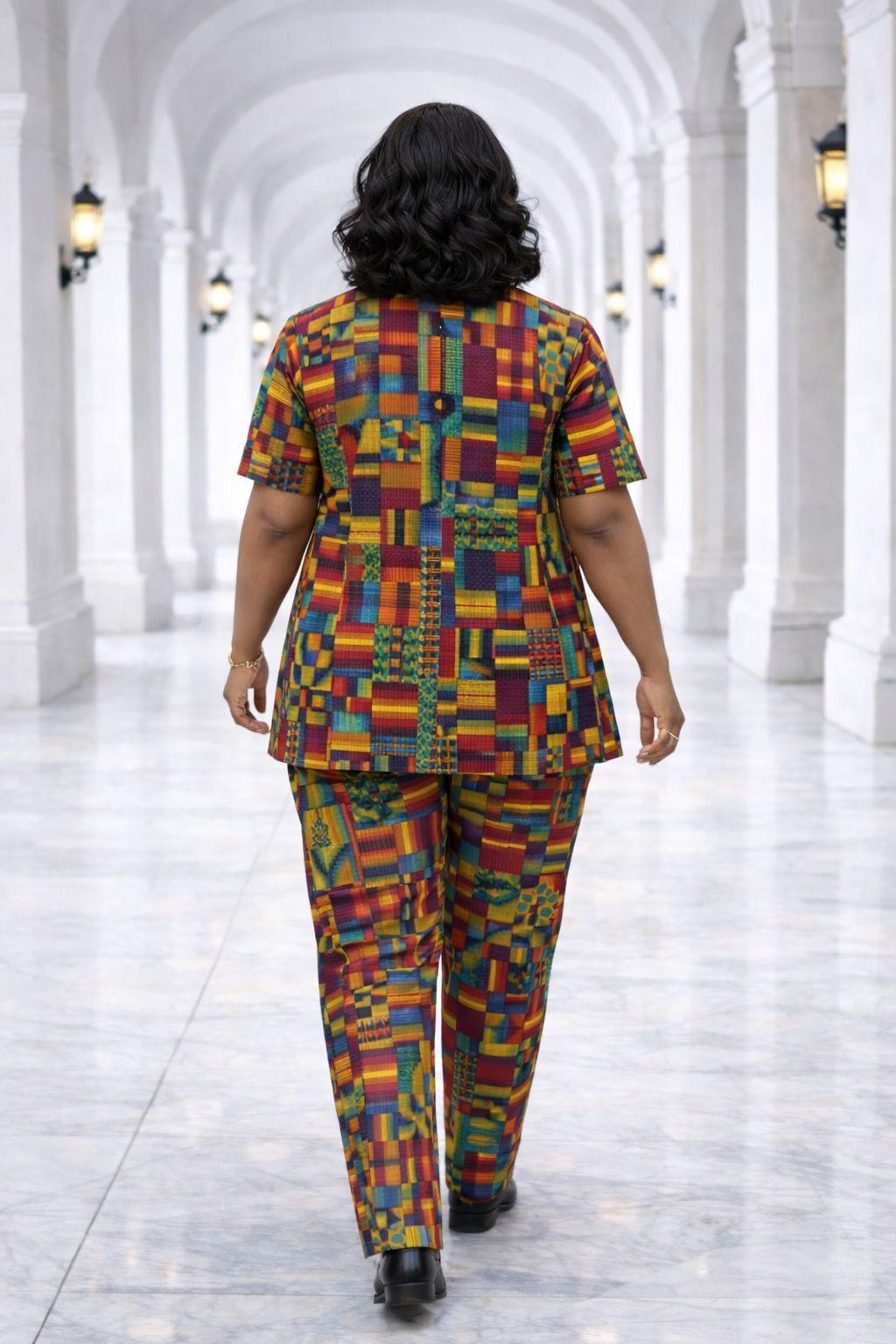 Add a burst of color to your wardrobe with this expertly tailored two-piece African print set. The ensemble features a coordinated tunic and trouser pairing, both showcasing a rich, multi-colored kente-style geometric pattern. The primary tunic is designed with a relaxed, slightly flared hem for a comfortable fit that moves with you, while the matching straight-leg trousers provide a streamlined, professional finish.