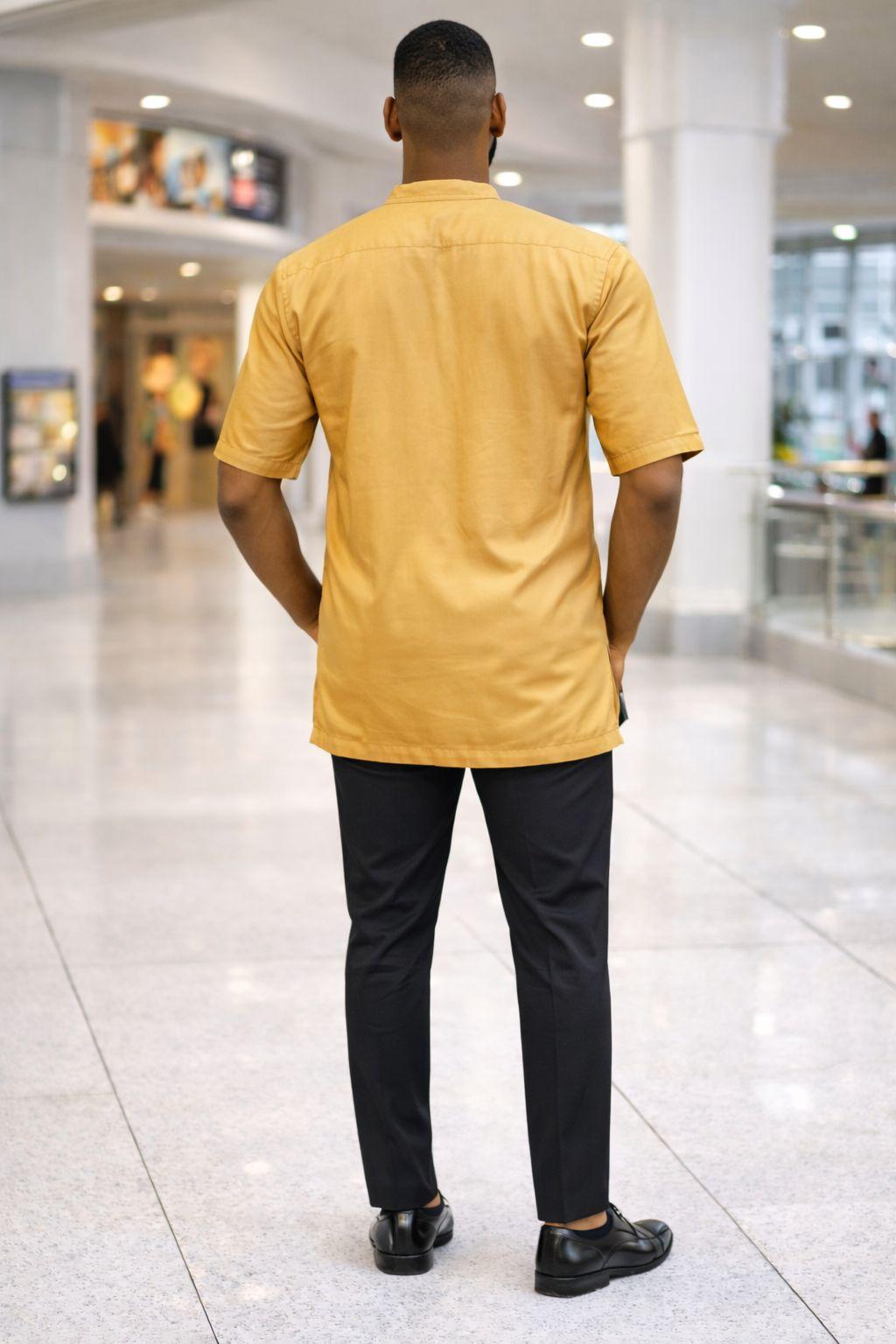 Modern Heritage Design This short-sleeve tunic stands out with its rich mustard yellow hue and contrasting black embroidery. The intricate patterns along the placket and cuffs are inspired by classic African motifs, offering a clean yet detailed look that moves away from overly busy prints. It features a modern mandarin collar and a functional three-button placket for a refined finish.