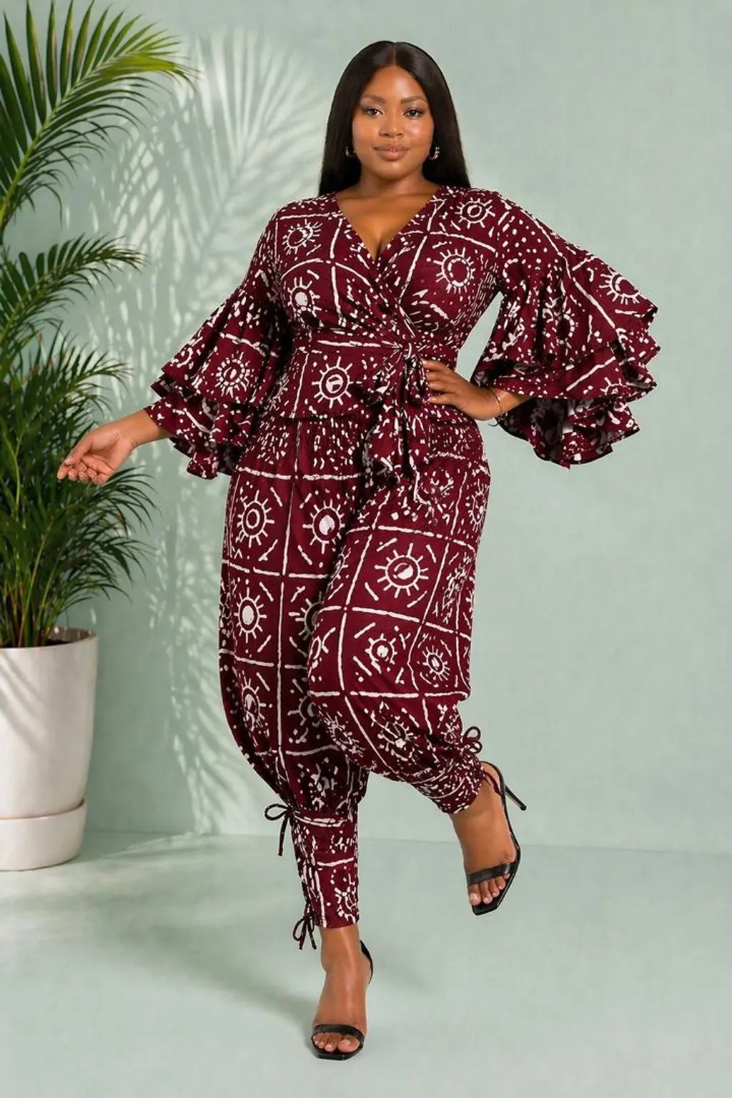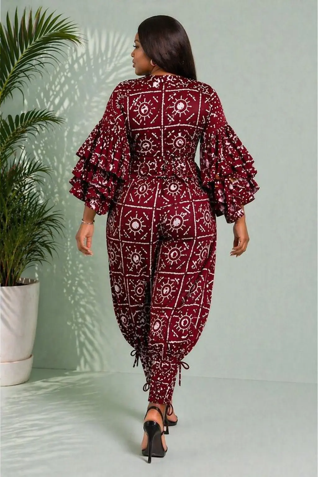 The Zola Maroon African Print Pants Set is a stunning fusion of architectural design and traditional storytelling. Featuring a rich burgundy wine base with a hand-drawn sun motif, this two-piece ensemble is crafted from 100% premium African wax cotton. The high-density fabric provides the necessary structure to keep the voluminous ruffles and balloon trousers looking crisp and intentional through hours of wear.